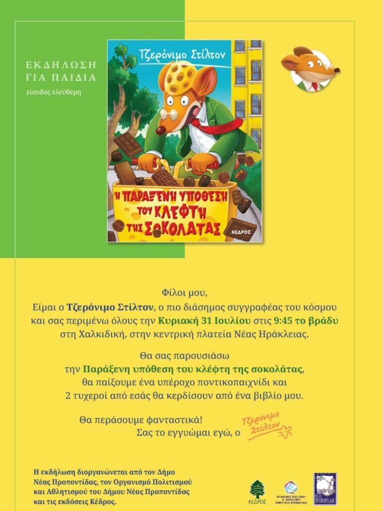 Σας προσκαλούμε στην παρουσίαση του Παιδικού Βιβλίου του Τζερόνιμο Στίλτον ” Η παράξενη υπόθεση του κλέφτη της σοκολάτας”.