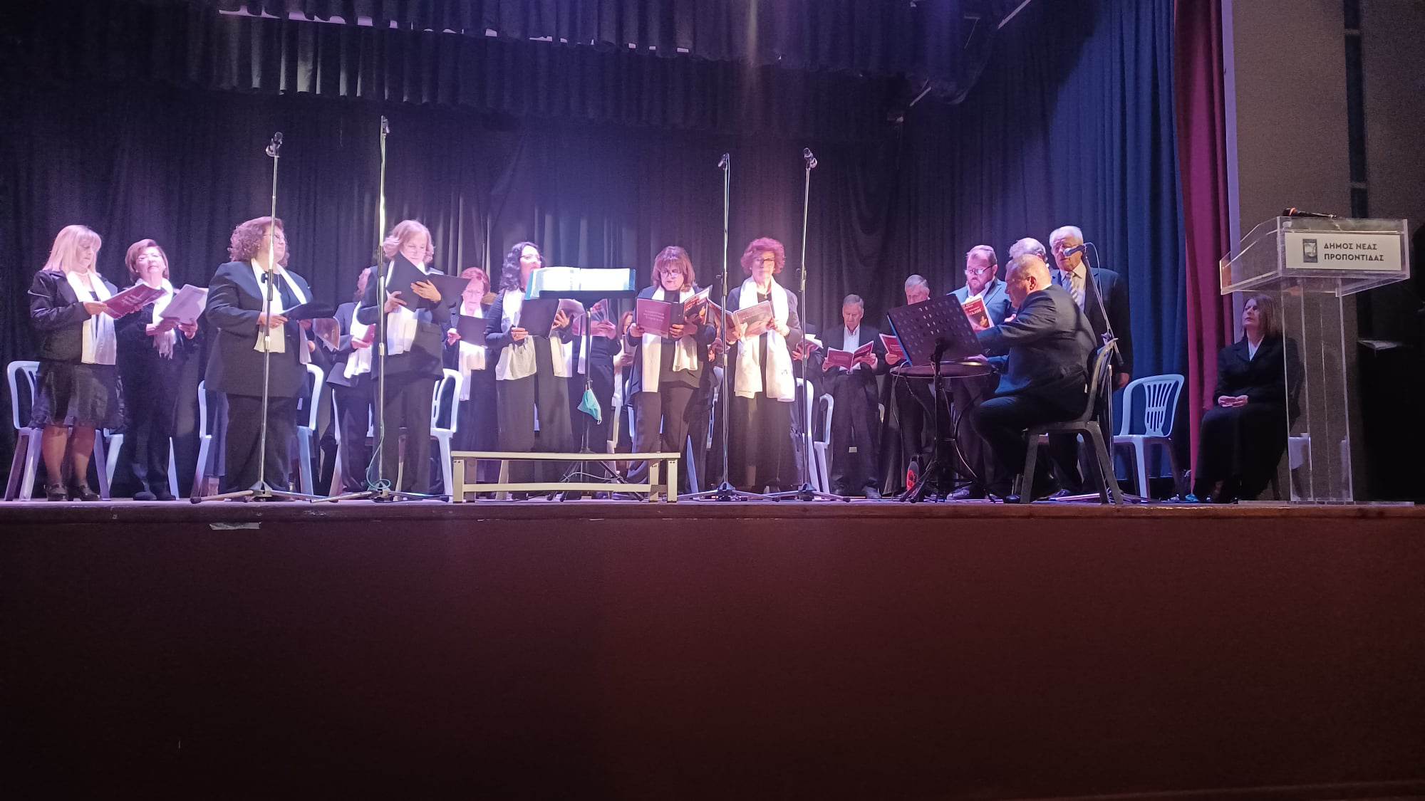 Οι χορωδοί της Μεικτής Δημοτικής Βυζαντινής χορωδίας “Αγιος Γεώργιος” και ο επί 20 χρόνια διευθύνων αυτήν, κ. Γεώργιος Ζουγλής, παρουσίασαν χθες Εκδήλωση – Μνημόσυνο για τα θύματα των Τεμπών στο Δημοτικό θέατρο Ν. Μουδανιών.
