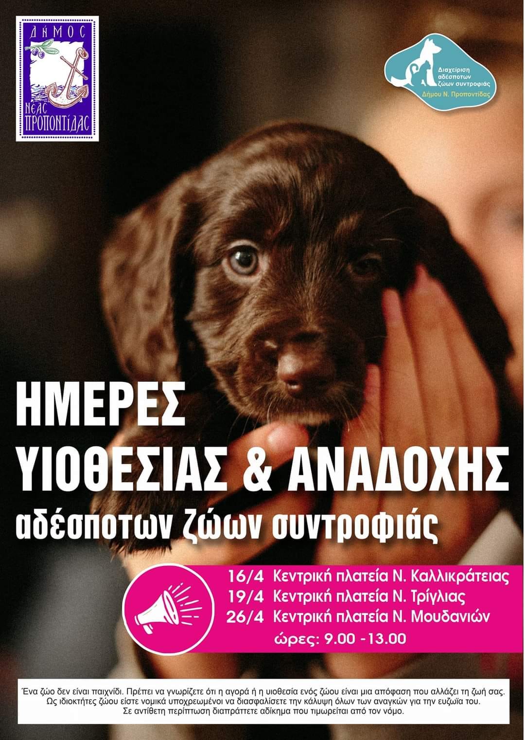 • Αν ενδιαφέρεστε να υιοθετήσετε ένα αδέσποτο ζώο, καλέστε στην Υπηρεσία Διαχείρισης Αδέσποτων Ζώων συντροφιάς Δήμου Ν. Προποντίδας, Τηλ. 2373350204 & 2373350241.