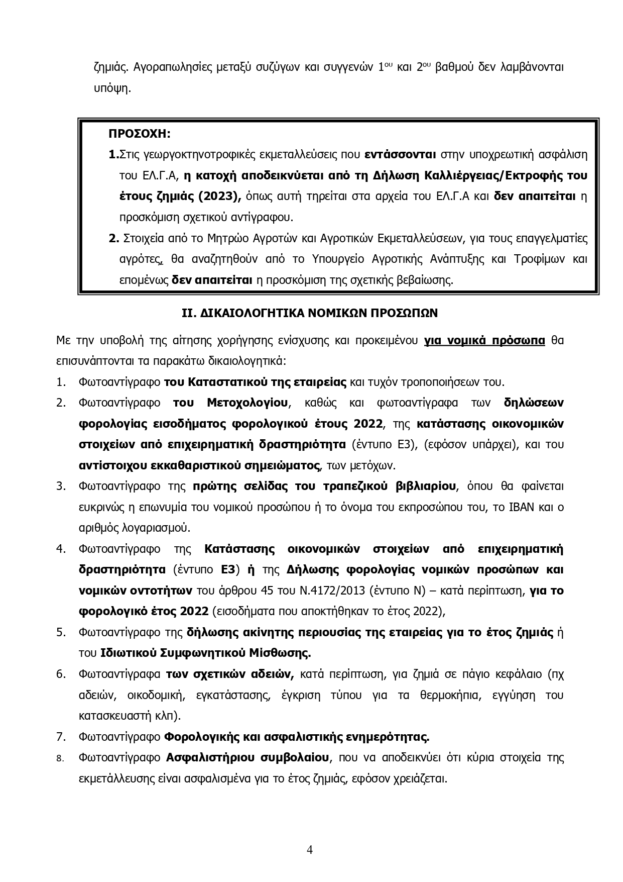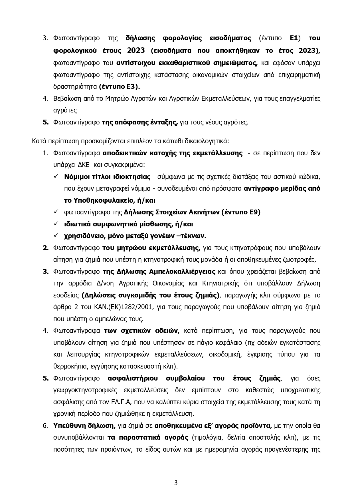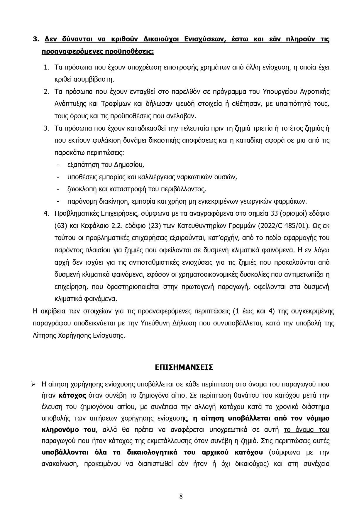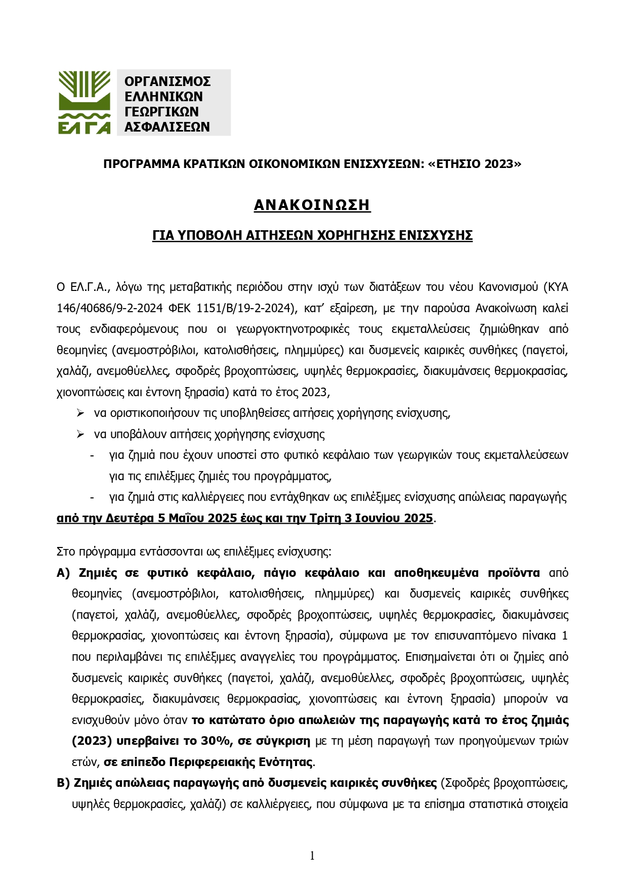 Ο ΕΛ.Γ.Α., λόγω της μεταβατικής περιόδου στην ισχύ των διατάξεων του νέου Κανονισμού (ΚΥΑ 146/40686/9-2-2024 ΦΕΚ 1151/Β/19-2-2024), κατ’ εξαίρεση, με την παρούσα Ανακοίνωση καλεί τους ενδιαφερόμενους που οι γεωργοκτηνοτροφικές τους εκμεταλλεύσεις ζημιώθηκαν από θεομηνίες (ανεμοστρόβιλοι, κατολισθήσεις, πλημμύρες) και δυσμενείς καιρικές συνθήκες (παγετοί, χαλάζι, ανεμοθύελλες, σφοδρές βροχοπτώσεις, υψηλές θερμοκρασίες, διακυμάνσεις θερμοκρασίας, χιονοπτώσεις και έντονη ξηρασία) κατά το έτος 2023: