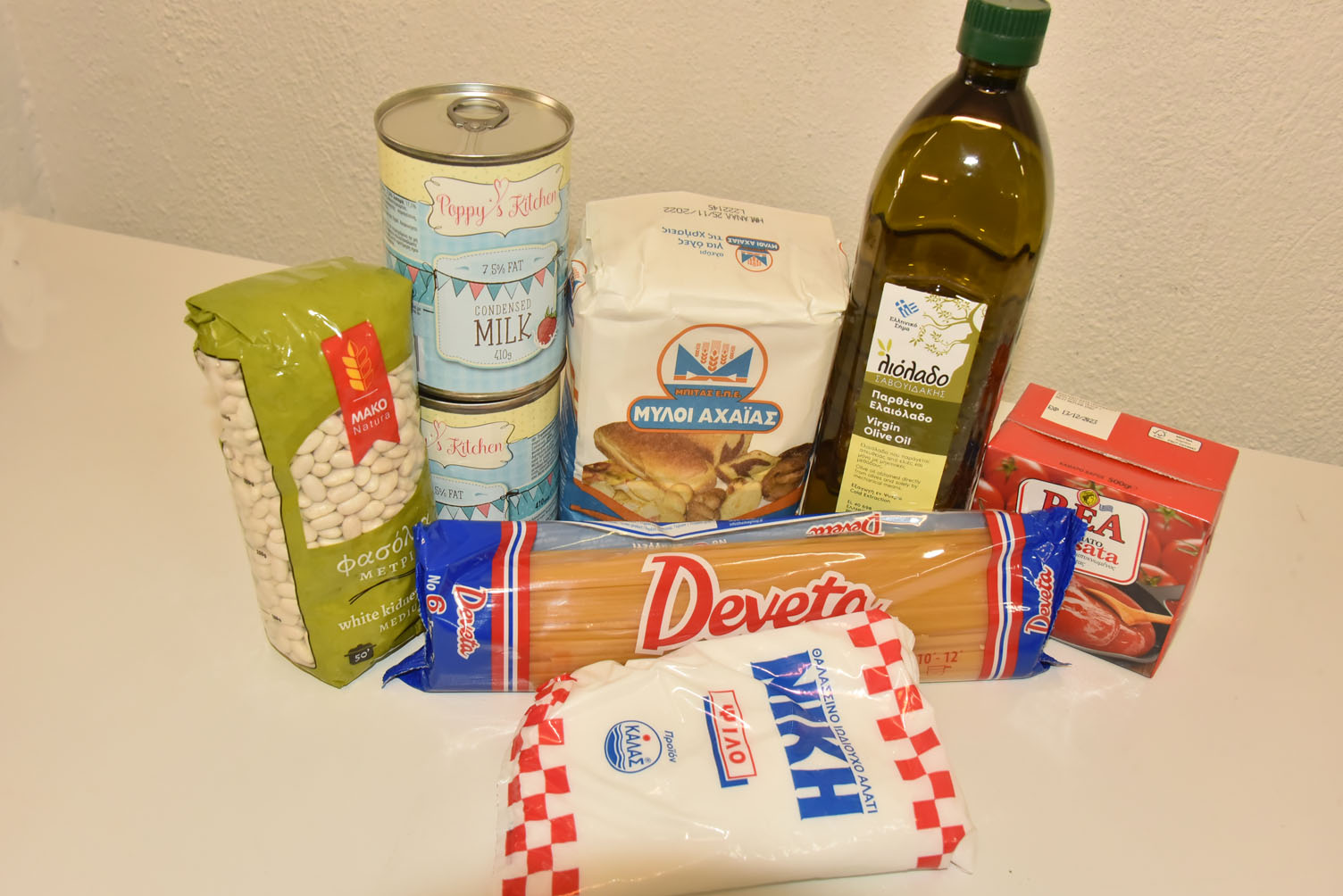 Αλάτι, ελαιόλαδο, φασόλια, σάλτσα, αλεύρι, σπαγγέτι, γάλα εβαπορέ ( 2 τεμάχια).