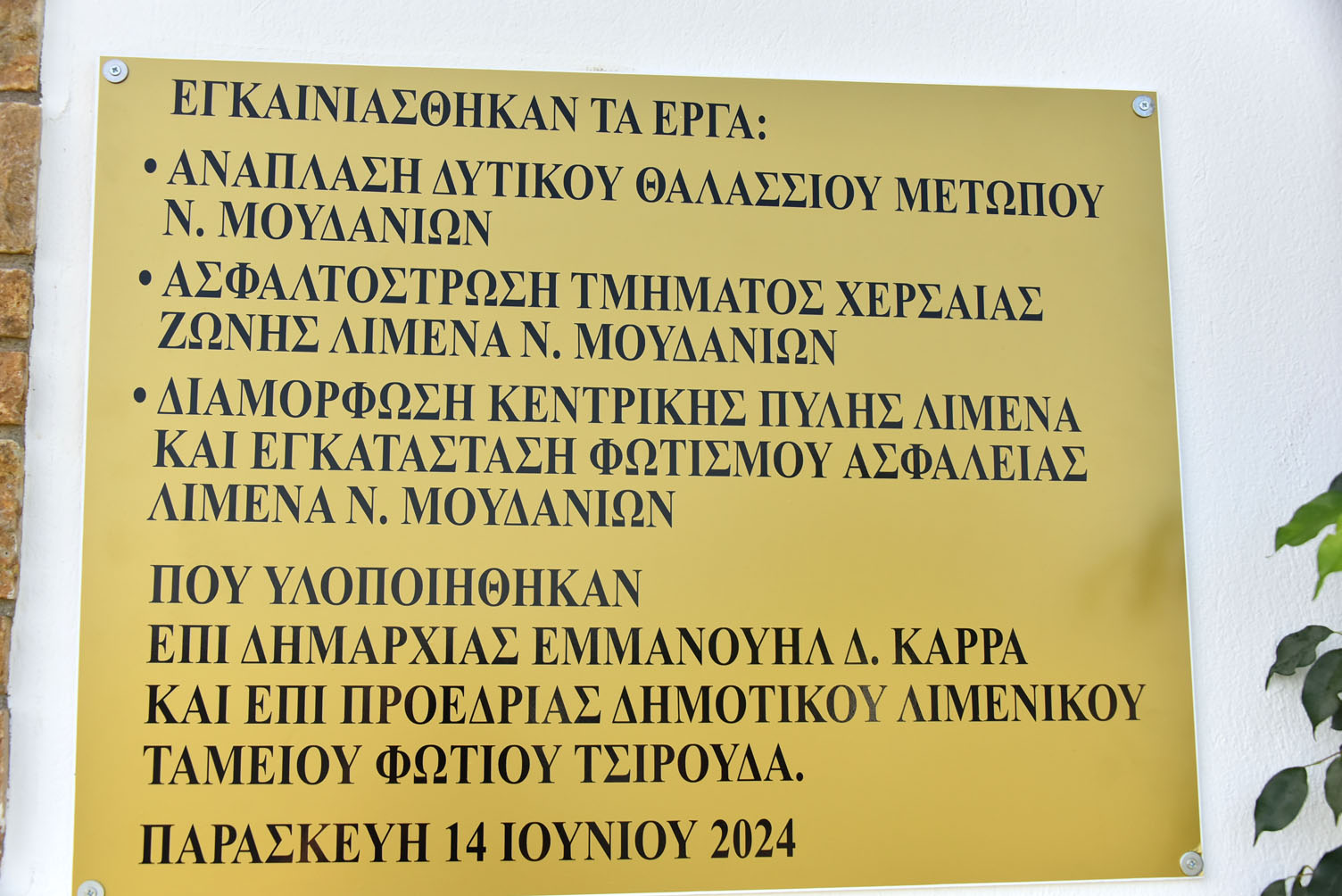 Μία σειρά έργων εγκαινιάσθηκαν την Παρασκευή 14 Ιουνίου 2024, στον χώρο του Δημοτικού Λιμενικού Ταμείου, από τον Δήμαρχο Ν. Προποντίδας κ. Καρρά Εμμανουήλ και από τον Πρόεδρο του Δημοτικού Λιμενικού Ταμείου κ. Τσιρούδα Φώτιου, παρουσία της Περιφερειακής Συμβούλου κ. Μέλας Χαντζαρίδου, Αντιδημάρχων, Δημοτικών Συμβούλων, της Υπολιμενάρχου Νέων Μουδανιών, της Προέδρου και μελών του Συμβουλίου Νέων Μουδανιών, των μελών της ΕΟΔ Χαλκιδικής και των υπαλλήλων του Δημοτικού Λιμενικού Ταμείου.