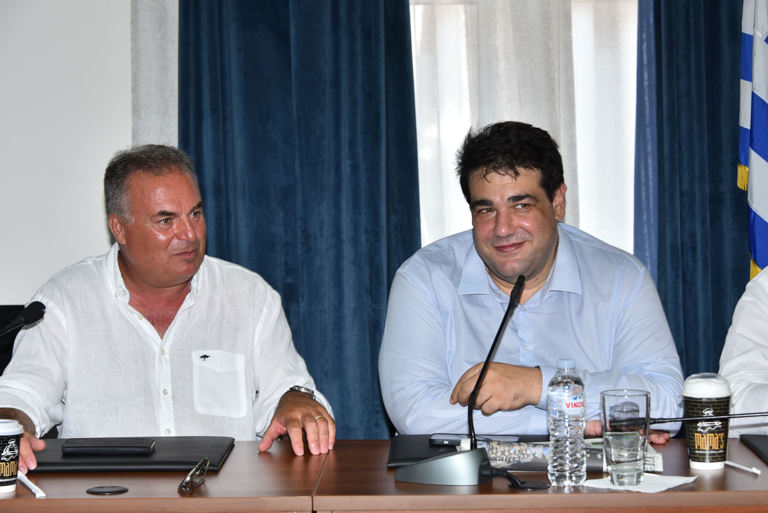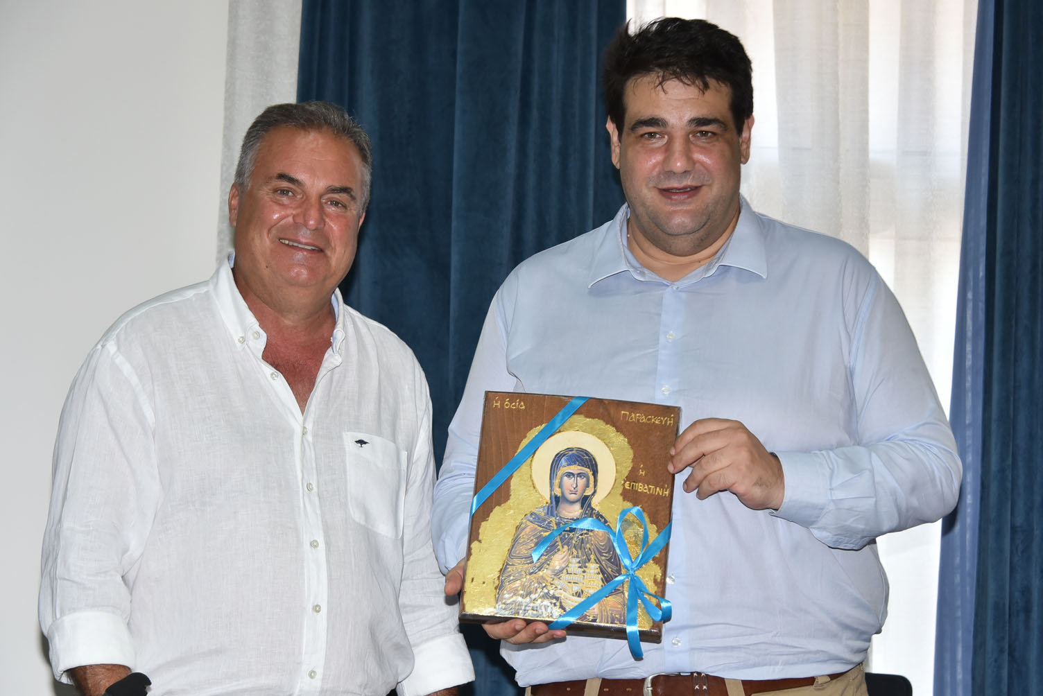 Ακολούθησε σύσκεψη στο Δημαρχείο, όπου ο Δήμαρχος παρουσίασε τα έργα που υλοποιούνται στον Δήμο μας μέσω διαφορετικών χρηματοδοτικών προγραμμάτων, ενώ ζήτησε τη στήριξη της πολιτείας για έργα ύδρευσης και άρδευσης, καθώς το μεγαλύτερο πρόβλημα είναι η έλλειψη νερού. Ενημέρωσε ότι ήδη υπάρχουν απόλυτα έτοιμα και δημοπρατημένα έργα ύδρευσης που αναζητείται η χρηματοδότησή τους. Τέλος, του παρέδωσε τιμητική πλακέτα για τη στήριξή του αλλά και την πρόσφατη απόφασή του να χρηματοδοτηθεί η κατασκευή του ειδικού γυμνασίου-λυκείου και ΕΕΕΚ του Δήμου μας.