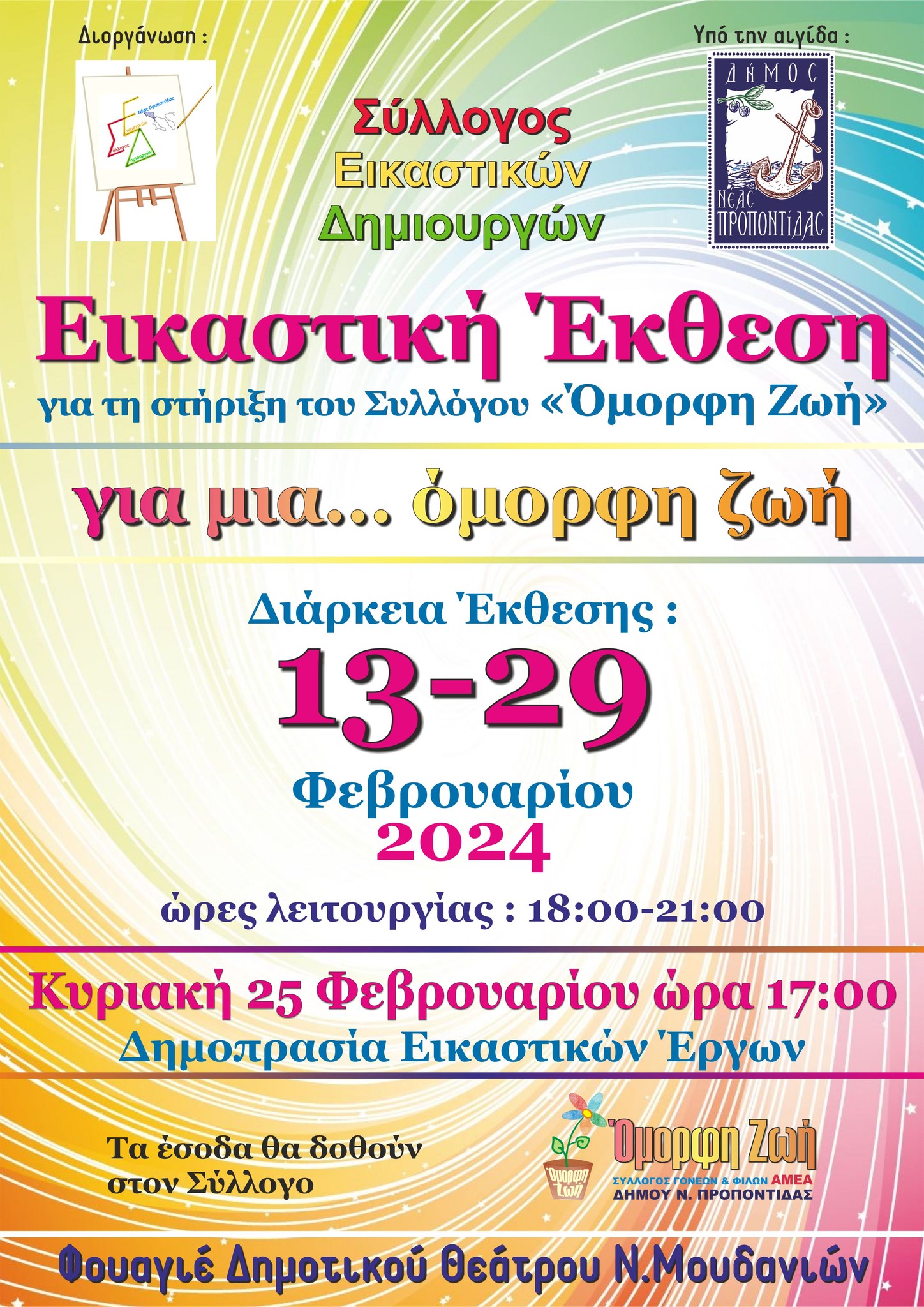 Η Εικαστική Έκθεση του Συλλόγου Εικαστικών Δημιουργών Νέας Προποντίδας, ‘’για μια . . . όμορφη ζωή‘’, η οποία λειτουργεί στο Φουαγιέ του Δημοτικού Θεάτρου Ν. Μουδανιών, καθημερινά και μέχρι τις 29 Φεβρουαρίου 2024 (18:00-21:00). έχει ως σκοπό τη στήριξη του Συλλόγου για τα άτομα με αναπηρία Ν. Προποντίδας “Όμορφη Ζωή”.