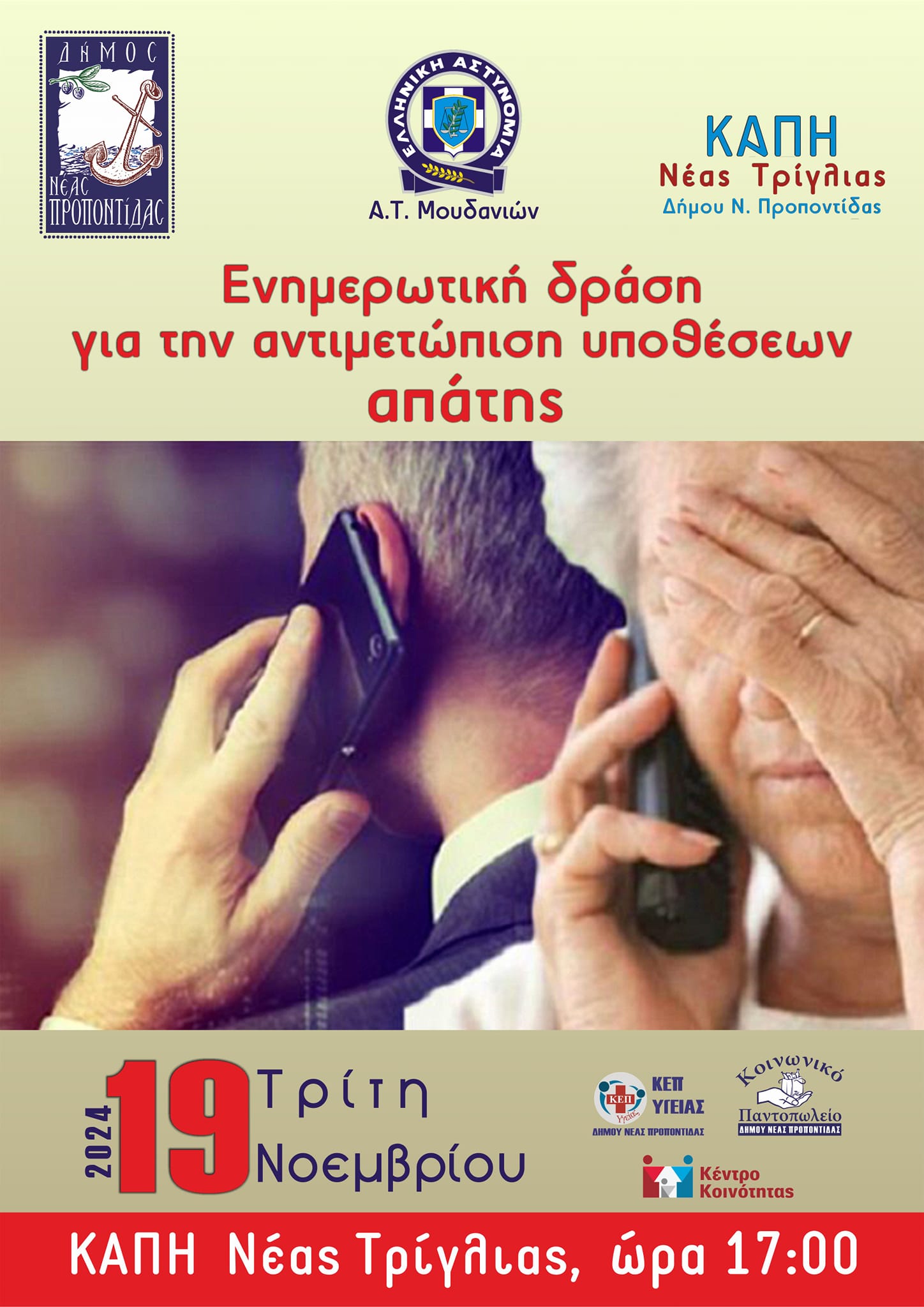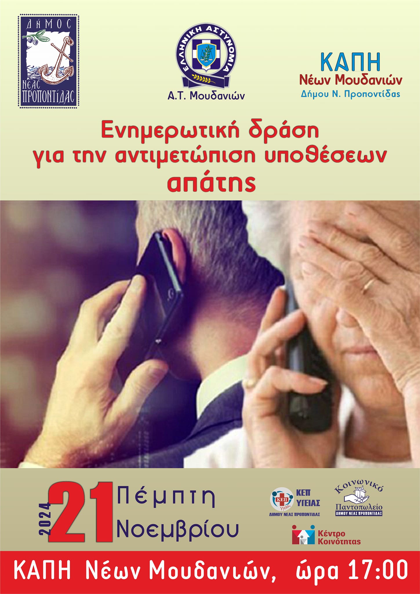 Ο Δήμος μας και το ΑΤ Ν. Μουδανιών θα πραγματοποιήσουν ενημερωτικές δράσεις για την αντιμετώπιση υποθέσεων απάτης ως εξής: