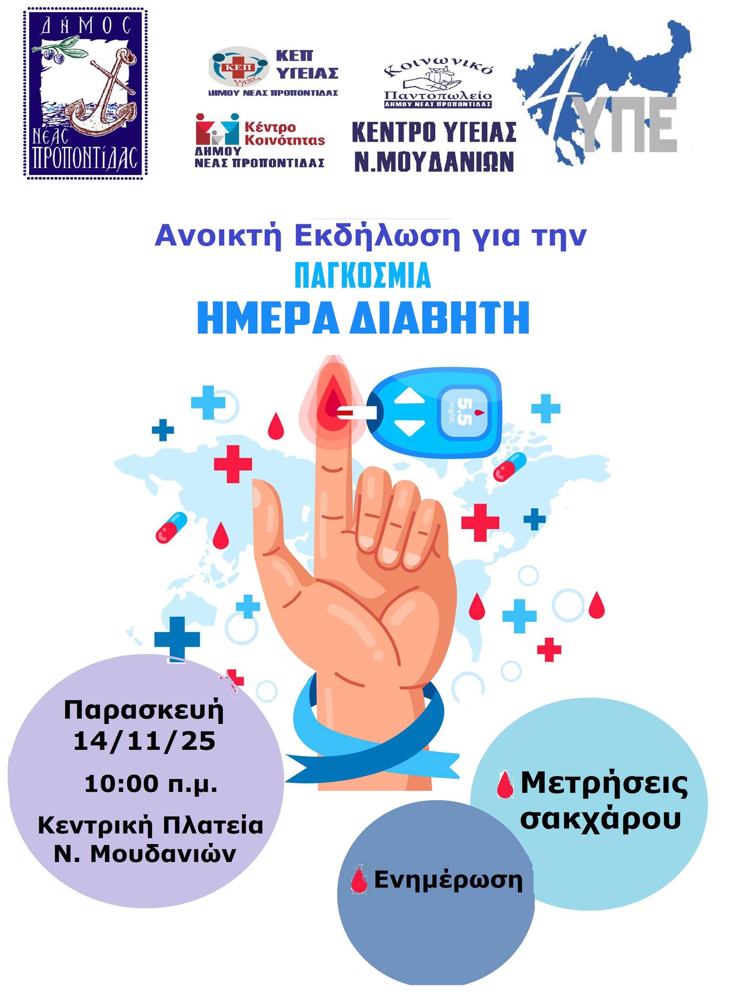 Με αφορμή την Παγκόσμια Ημέρα Σακχαρώδη Διαβήτη, ο Δήμος Νέας Προποντίδας σε συνεργασία με το Κέντρο Υγείας Ν. Μουδανιών, διοργανώνουν ενημερωτική εκδήλωση για την πρόληψη και τη διαχείριση του διαβήτη.