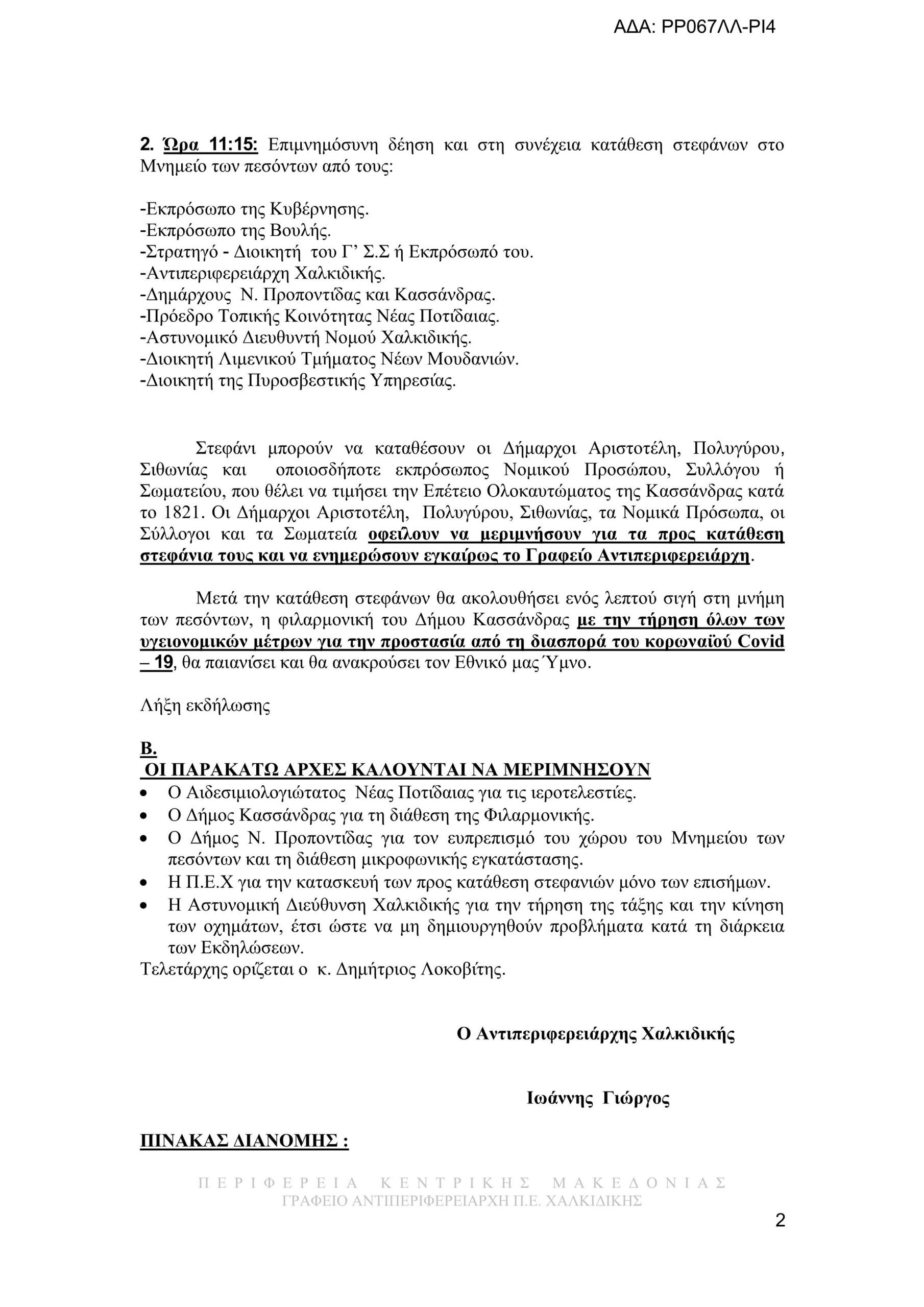 Μετά την κατάθεση στεφάνων θα ακολουθήσει ενός λεπτού σιγή στη μνήμη των πεσόντων, η φιλαρμονική του Δήμου Κασσάνδρας με την τήρηση όλων των υγειονομικών μέτρων για την προστασία από τη διασπορά του κορωναϊού Covid – 19, θα παιανίσει και θα ανακρούσει τον Εθνικό μας Ύμνο.