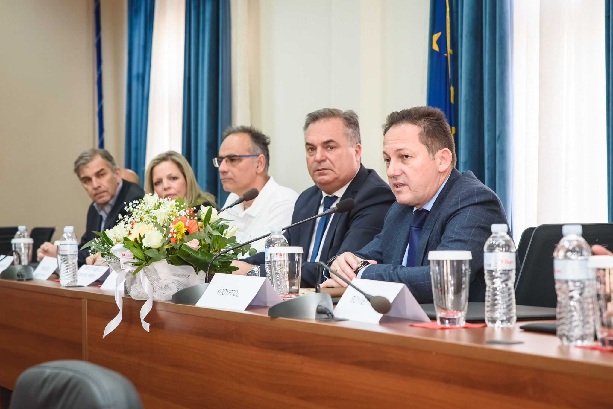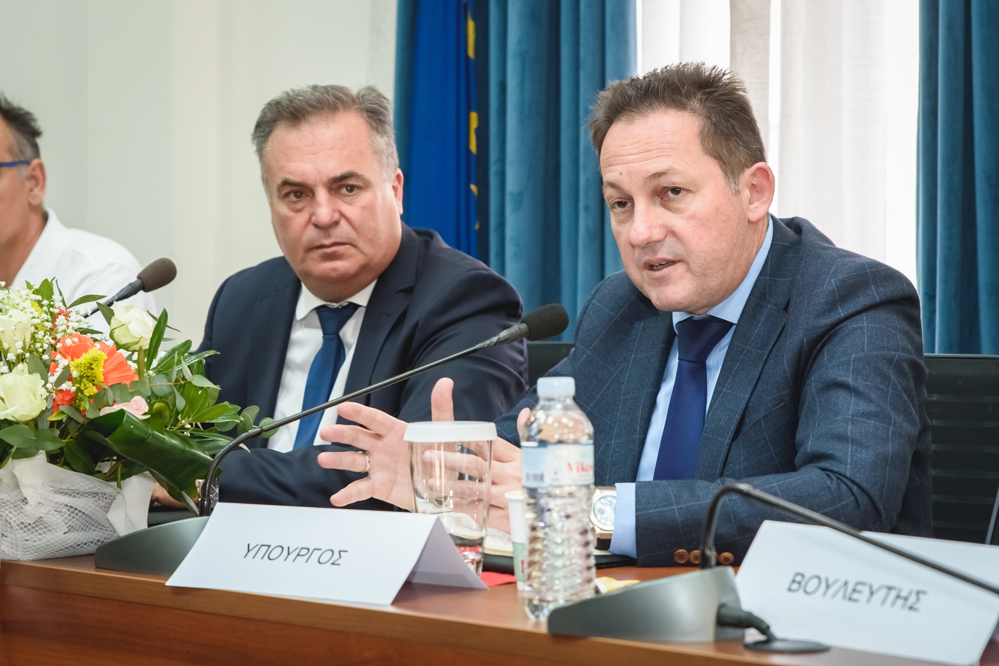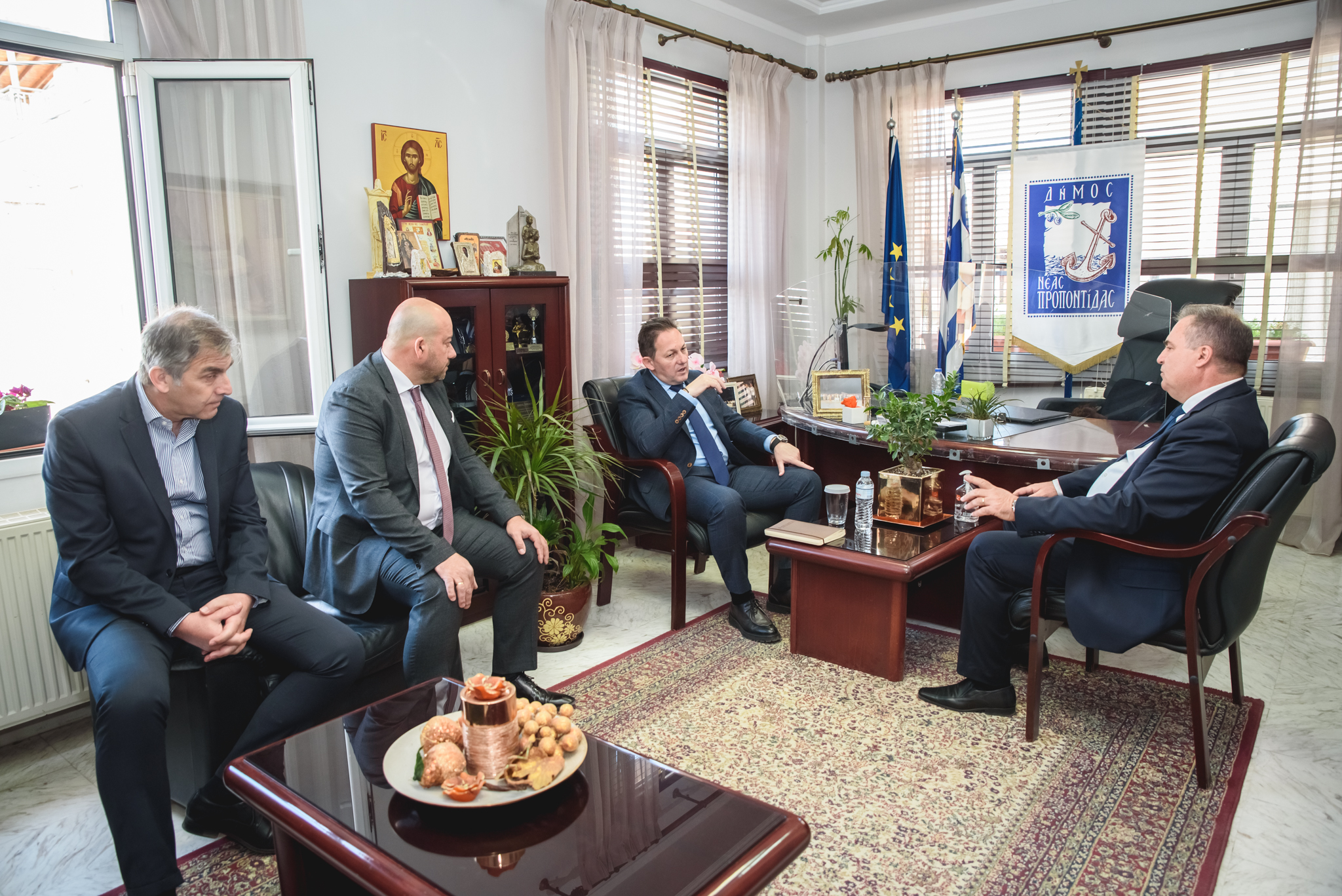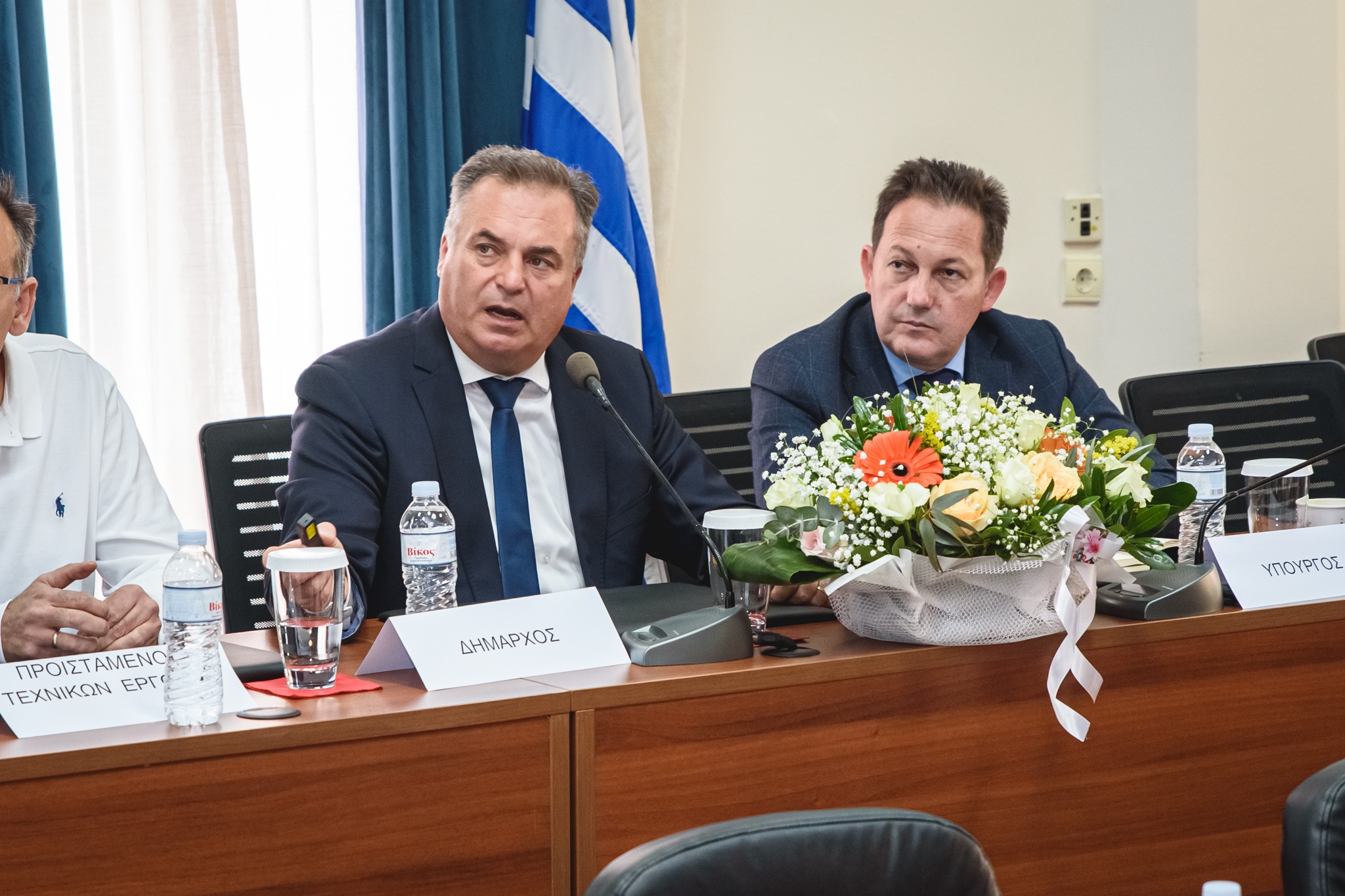 Ο Δήμαρχος Μ. Καρράς παρουσίασε τα έργα που υλοποιήθηκαν ή έχουν ενταχθεί στα χρηματοδοτικά προγράμματα «ΦΙΛΟΔΗΜΟΣ Ι» και «ΦΙΛΟΔΗΜΟΣ ΙΙ» του Υπουργείου Εσωτερικών. Δεν παρέλειψε να τον ευχαριστήσει για την πολύ καλή συνεργασία και τη βοήθειά του στην προώθηση των ζητημάτων του Δήμου μας. Εστίασε στην αναγκαιότητα του έργου «Κατασκευή δικτύων πόσιμου νερού», καθώς και στην κατασκευή μονάδας αφαλάτωσης στα Ν. Μουδανιά, που θα επεξεργάζεται νερό από υφάλμυρες γεωτρήσεις. Δεν παρέλειψε ακόμη να αναφερθεί στην πρόθεση του Δήμου να προχωρήσουν φράγματα αλλά και μονάδες επεξεργασίας λυμάτων σε όλες τις εγκαταστάσεις βιολογικών, καθώς οι αρδευτικές ανάγκες είναι επίσης μεγάλες.
