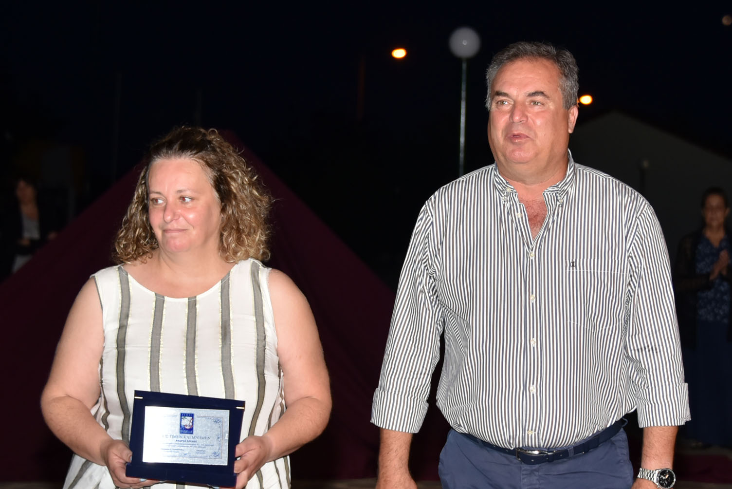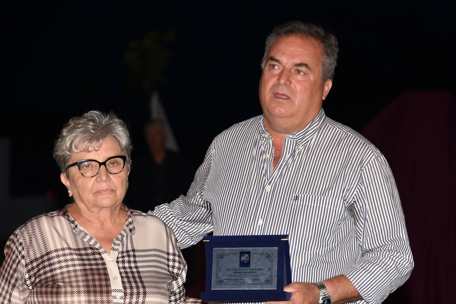 Ο Δήμαρχος εμφανώς συγκινημένος, παρέδωσε τιμητικές πλακέτες στη σύζυγο του Σωτήρη Σαπουντζή, Δήμητρα, καθώς και στην αδελφή του Ανδρέα Λέλεκα, Μάρθα. Μίλησε για την ανεκτίμητη προσφορά και των δύο αλλά και για τις σπουδαίες προσωπικότητές τους.