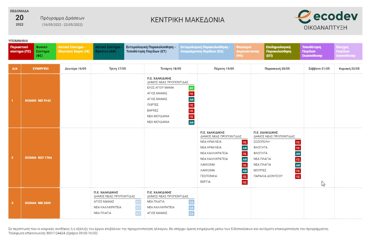 Δείτε παρακάτω το αναλυτικό πρόγραμμα ψεκασμών που ισχύει από την Δευτέρα 16/5/2022 έως και την Παρασκευή 20/5/2022.