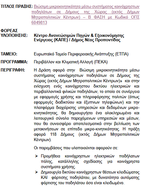 ΤΙΤΛΟΣ ΠΡΑΞΗΣ: Βιώσιμη μικροκινητικότητα μέσω συστήματος κοινόχρηστων ποδηλάτων σε Δήμους της Χώρας (εκτός Δήμων Μητροπολιτικών Κέντρων) – Β ΦΑΣΗ με Κωδικό ΟΠΣ 6049813