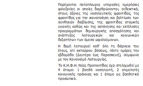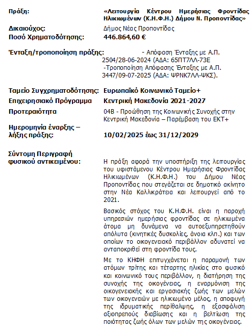 Λειτουργία Κέντρου Ημερήσιας Φροντίδας Ηλικιωμένων (Κ.Η.Φ.Η.) Δήμου Ν. Προποντίδας
