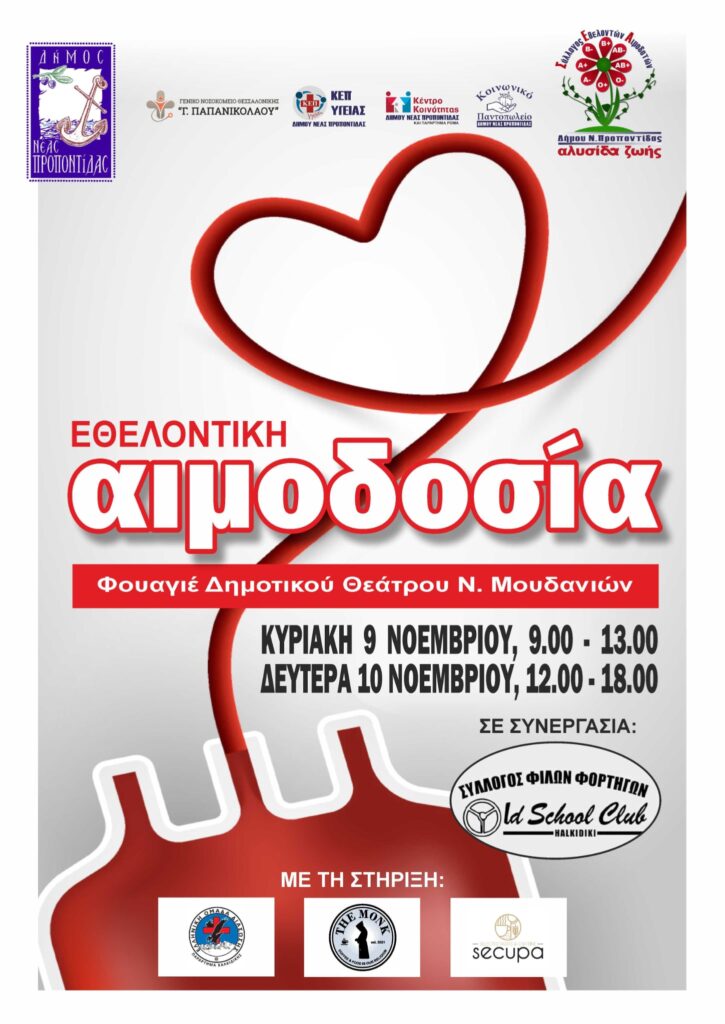 Ο Δήμος Νέας Προποντίδας, σε συνεργασία με τον Σύλλογο Φίλων φορτηγών “Old school club Halkidiki”, διοργανώνουν εθελοντική αιμοδοσία στο φουαγιέ του Δημοτικού Θεάτρου Ν. Μουδανιών.