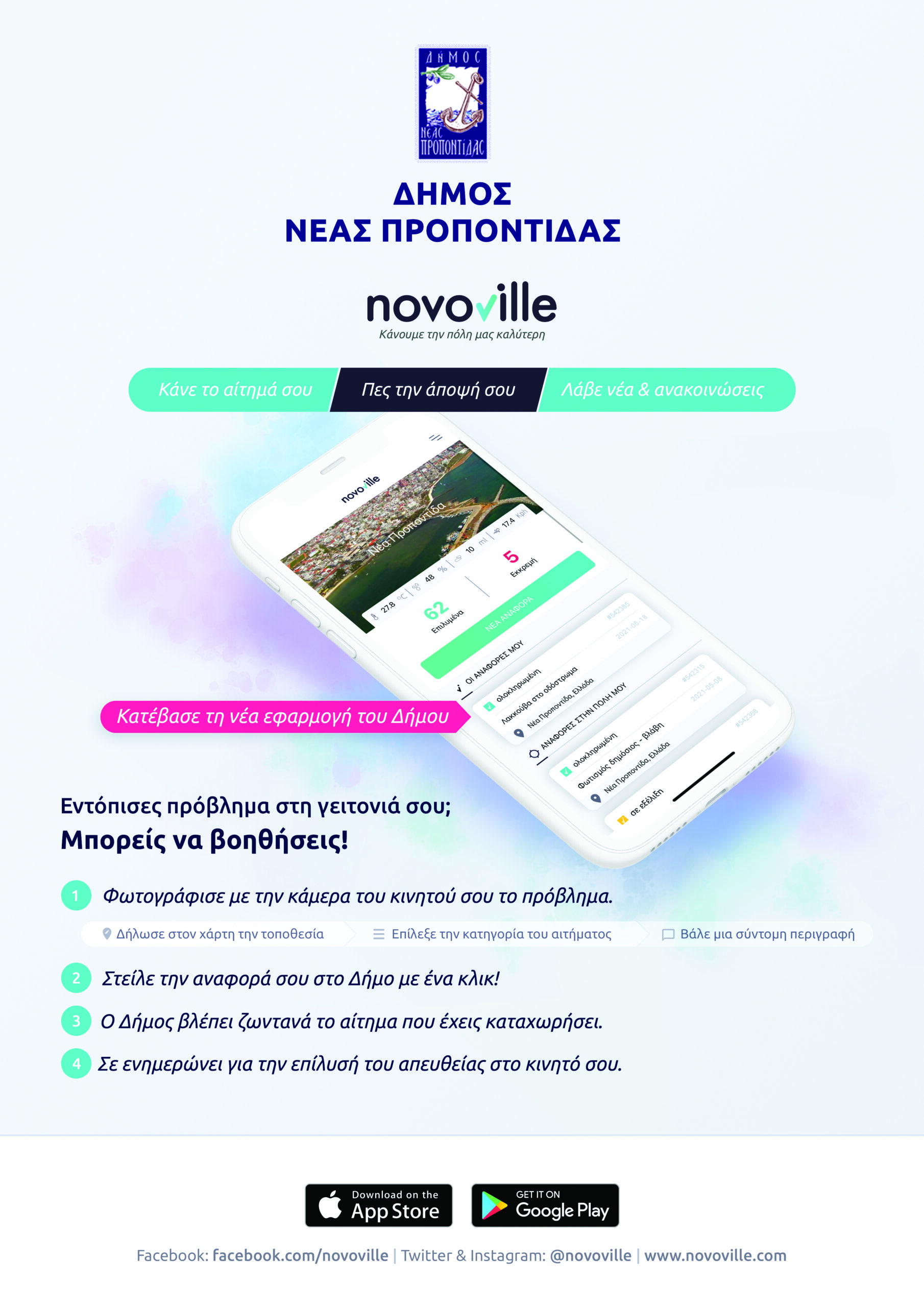 Η πλατφόρμα Novoville προσφέρει στους πολίτες τη δυνατότητα αποστολής αιτημάτων, μέσω δωρεάν εφαρμογής για κινητά τηλέφωνα, με σκοπό τη διευθέτηση ζητημάτων που αφορούν τη λειτουργία των παρεχόμενων υπηρεσιών του Δήμου μας. Ο δημότης ή επισκέπτης του Δήμου μπορεί να δηλώνει σε πραγματικό χρόνο προβλήματα που συναντά στην καθημερινότητα του, όπως π.χ. διαρροή υδάτων, καμένες λάμπες, λακκούβες στο οδόστρωμα, μέχρι και έκτακτα περιστατικά που απαιτούν την δημοτική συνδρομή. Κάθε πολίτης μπορεί να στείλει άμεσα, χωρίς κόστος και χωρίς να τηλεφωνήσει ή να επισκεφτεί τον Δήμο όλα τα αιτήματα που τον αφορούν.