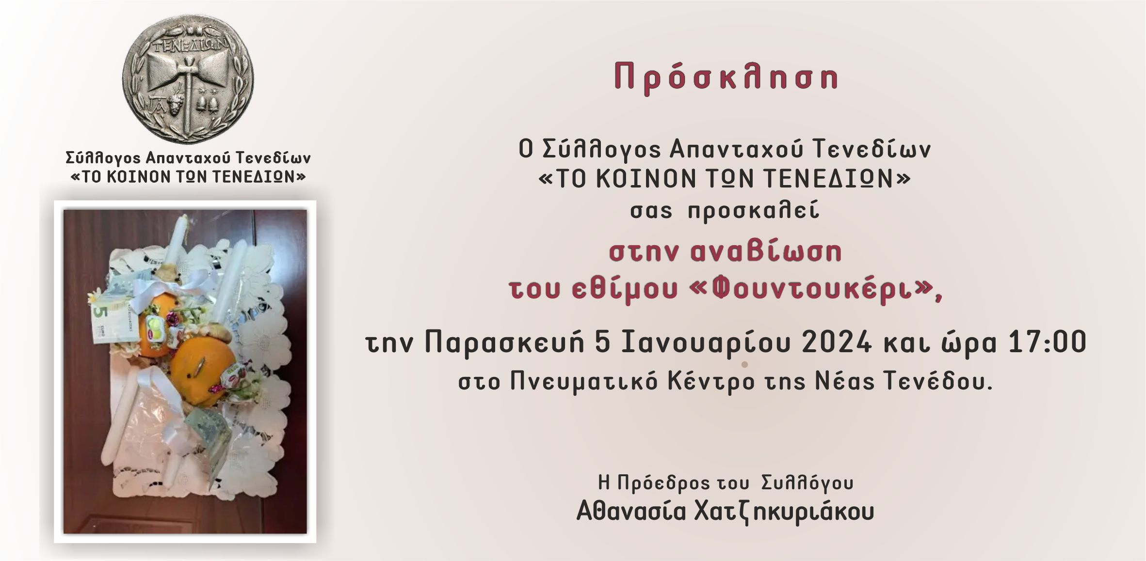Ο Σύλλογος Απανταχού Τενεδίων “Το κοινόν των Τενεδίων” σας προσκαλεί στην αναβίωση του εθίμου “ΦΟΥΝΤΟΥΚΕΡΙ”, την Παρασκευή 5 Ιανουαρίου και ώρα 17.00 στο Πνευματικό Κέντρο της Ν. Τενέδου.