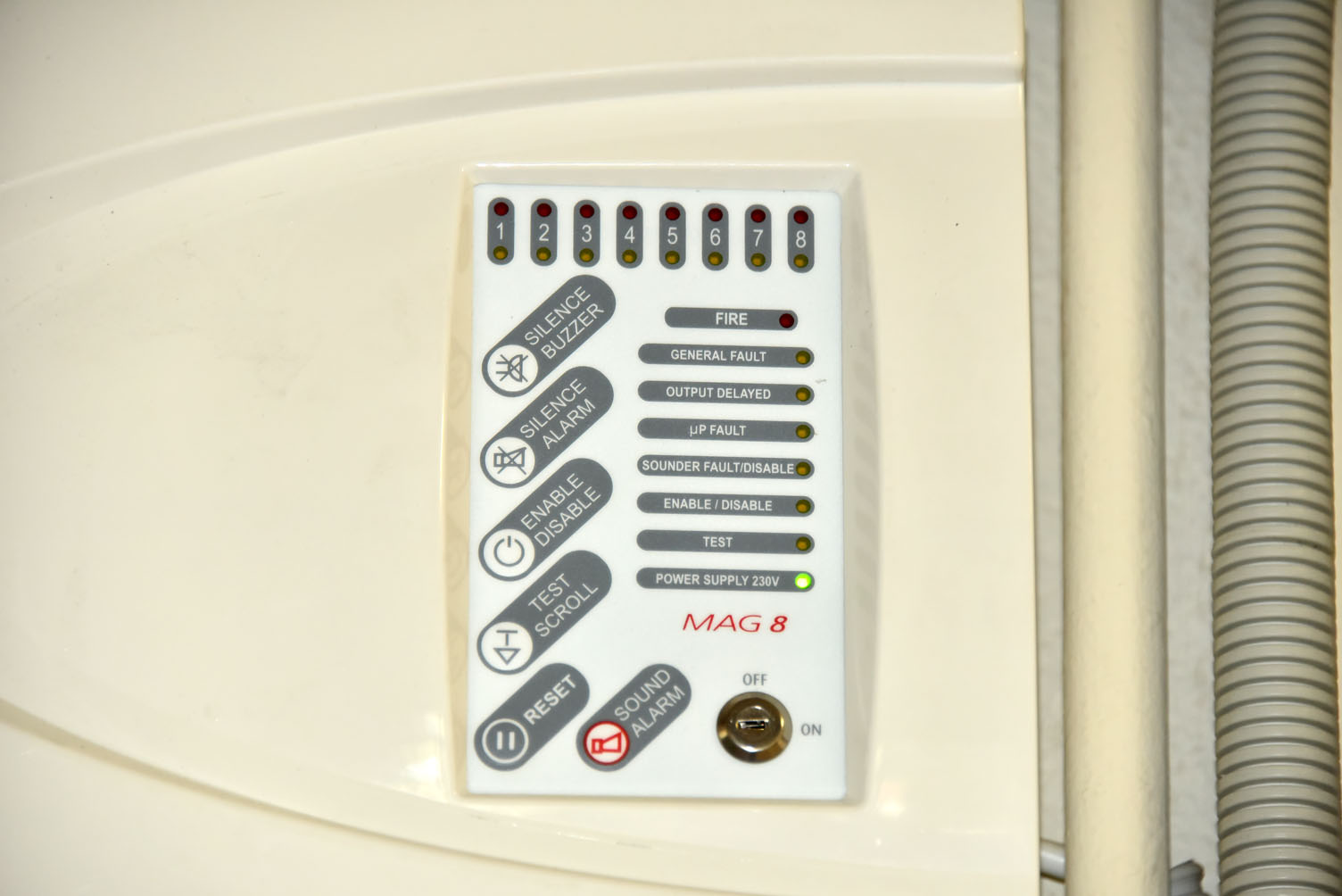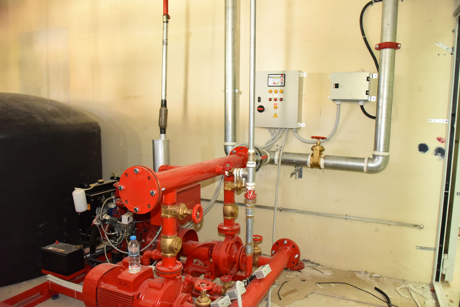 • αυτόματων συστημάτων πυροπροστασίας με πίνακες πυρανίχνευσης, ανιχνευτές αερίου, καπνού και θερμοδιαφορικούς, με ηχητική και φωνητική ένδειξη (σύστημα αναγγελίας πυρκαγιάς), φωτεινούς επαναλήπτες, σειρήνες συναγερμού, φαροσειρήνες.