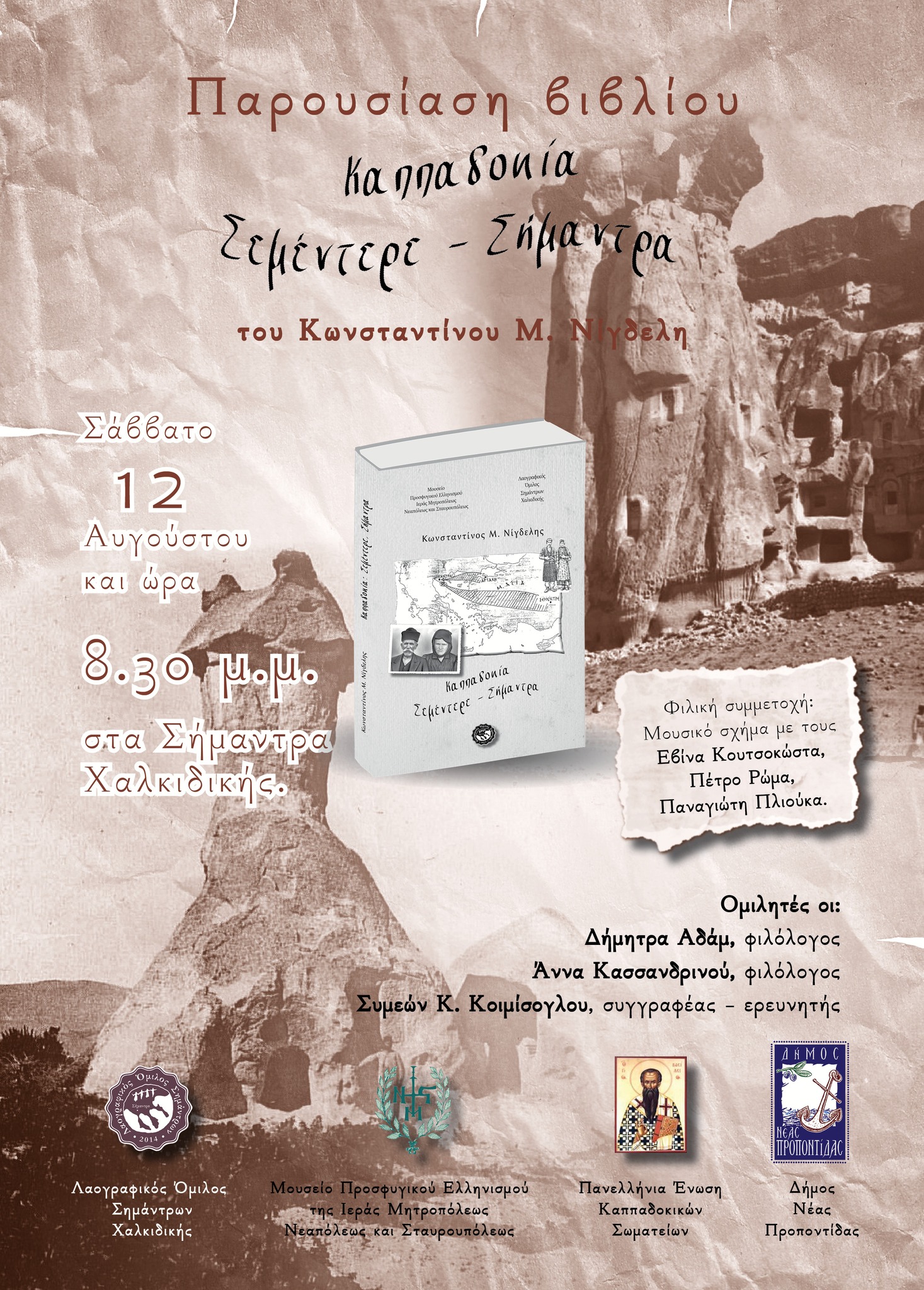 Το μουσείο Προσφυγικού Ελληνισμού της Ιεράς Μητροπόλεως Νεαπόλεως και Σταυρουπόλεως, ο Λαογραφικός Όμιλος Σημάντρων Χαλκιδικής , η Πανελλήνια Ένωση Καππαδοκικών Σωματείων και ο Δήμος Προποντίδας σας προσκαλούν στην παρουσίαση βιβλίου ‘’Καππαδοκία – Σεμέντερε – Σήμαντρα‘’ του Κωνσταντίνου Νίγδελη, το Σάββατο 12 Αυγούστου και ώρα 8:30 μ.μ., στα Σήμαντρα Χαλκιδικής.