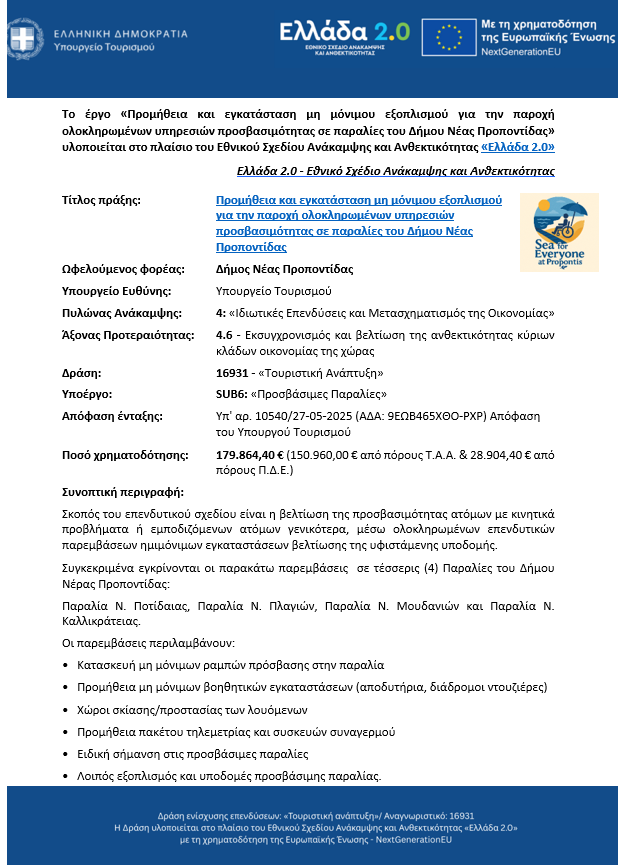 Προμήθεια και εγκατάσταση μη μόνιμου εξοπλισμού για την παροχή ολοκληρωμένων υπηρεσιών προσβασιμότητας σε παραλίες του Δήμου Νέας Προποντίδας