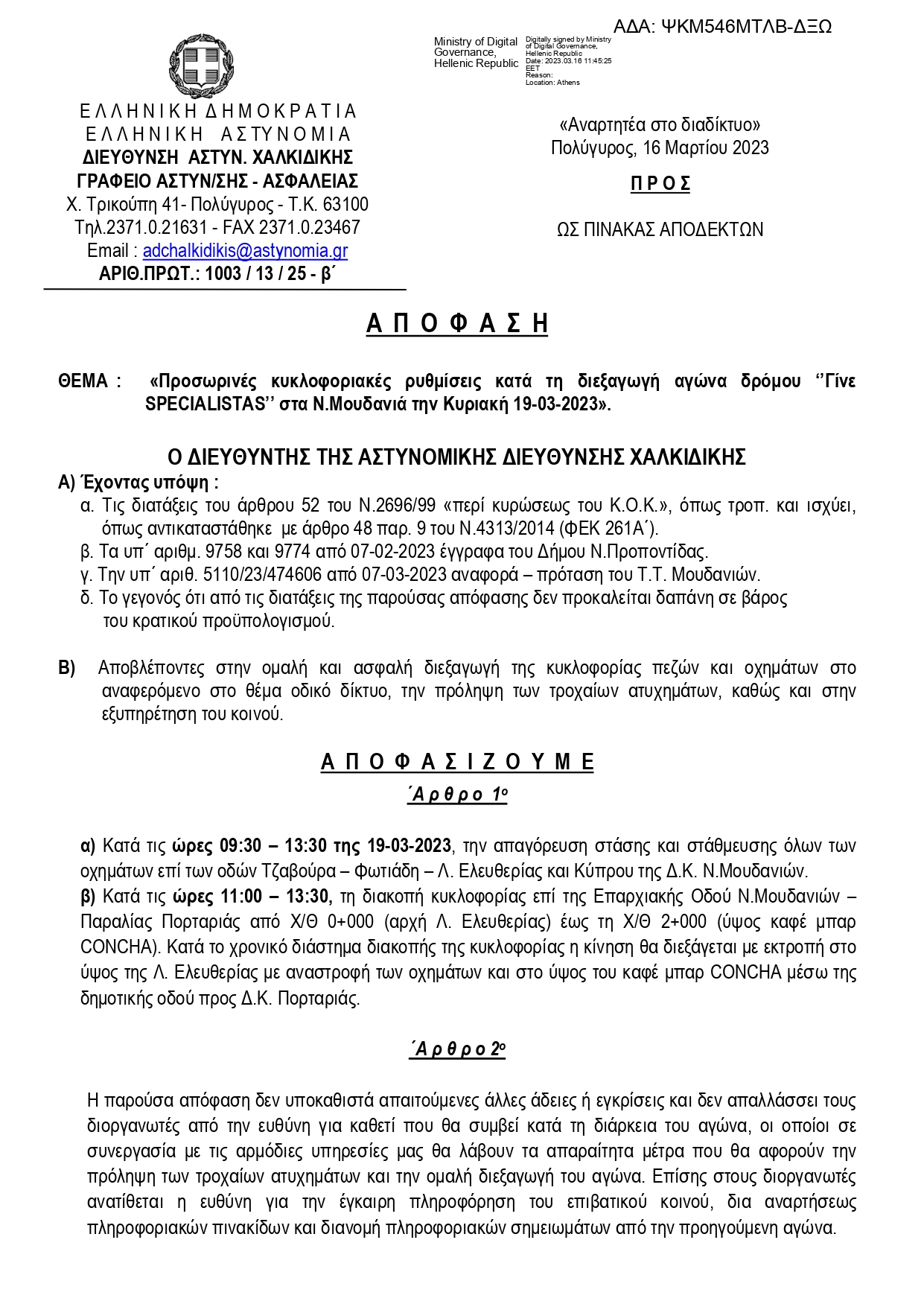 «Προσωρινές κυκλοφοριακές ρυθμίσεις κατά τη διεξαγωγή αγώνα δρόμου ‘’Γίνε SPECIALISTAS’’ στα Ν.Μουδανιά την Κυριακή 19-03-2023».