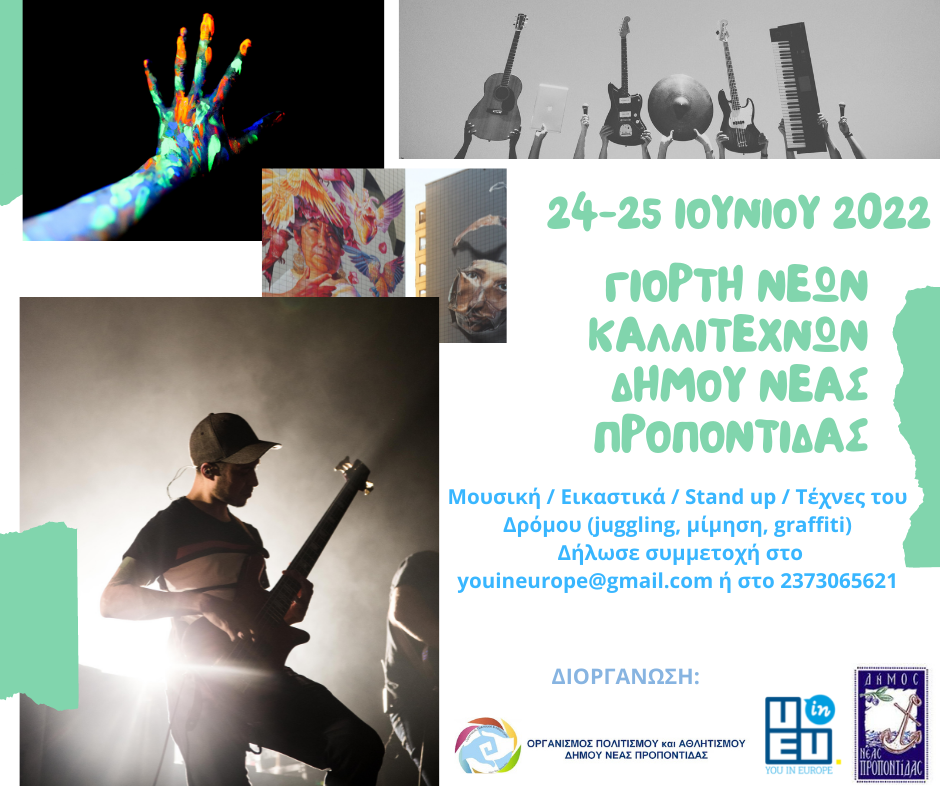 Το You in Europe σε συνεργασία με τον Δήμο Ν. Προποντίδας και τον Οργανισμό Πολιτισμού και Αθλητισμού του Δήμου, διοργανώνουν τη “Γιορτή Νέων Καλλιτεχνών”, μια ξεχωριστή εκδήλωση για τους νέους της περιοχής μας.