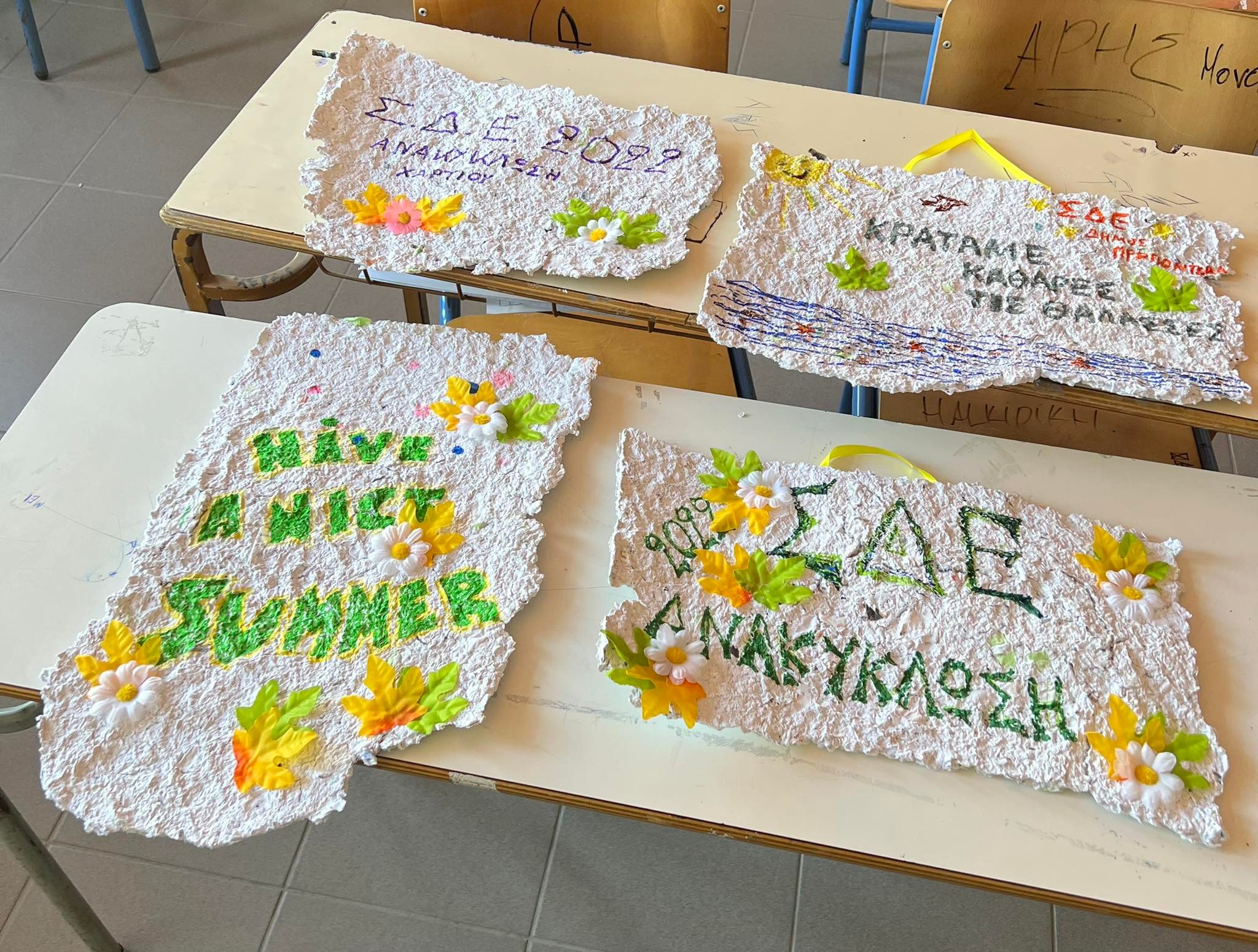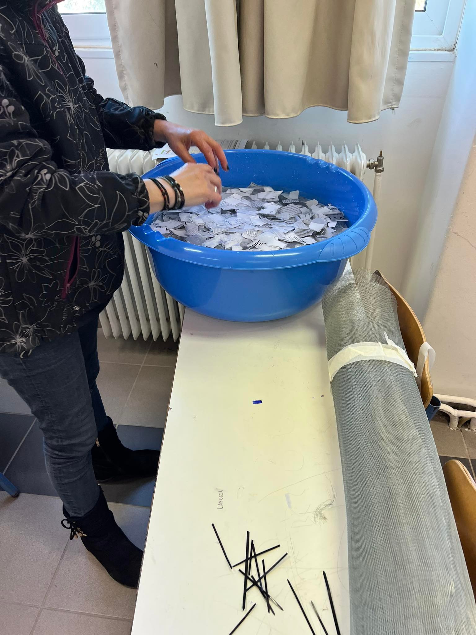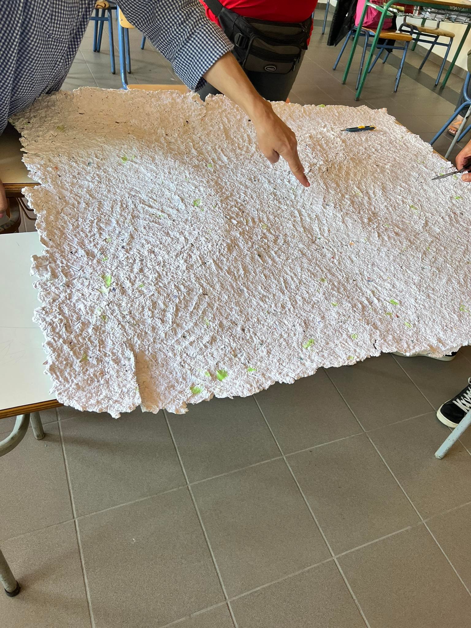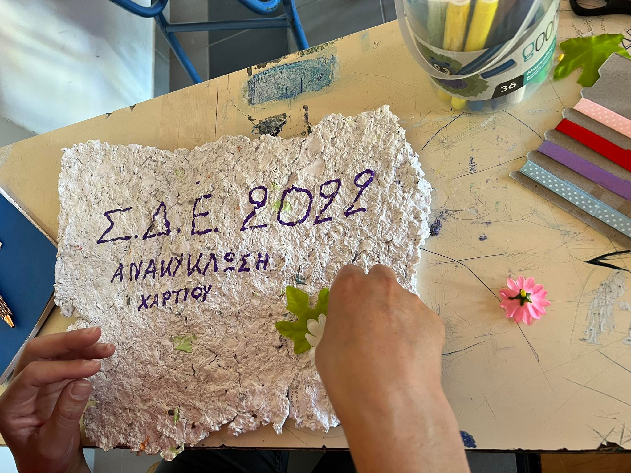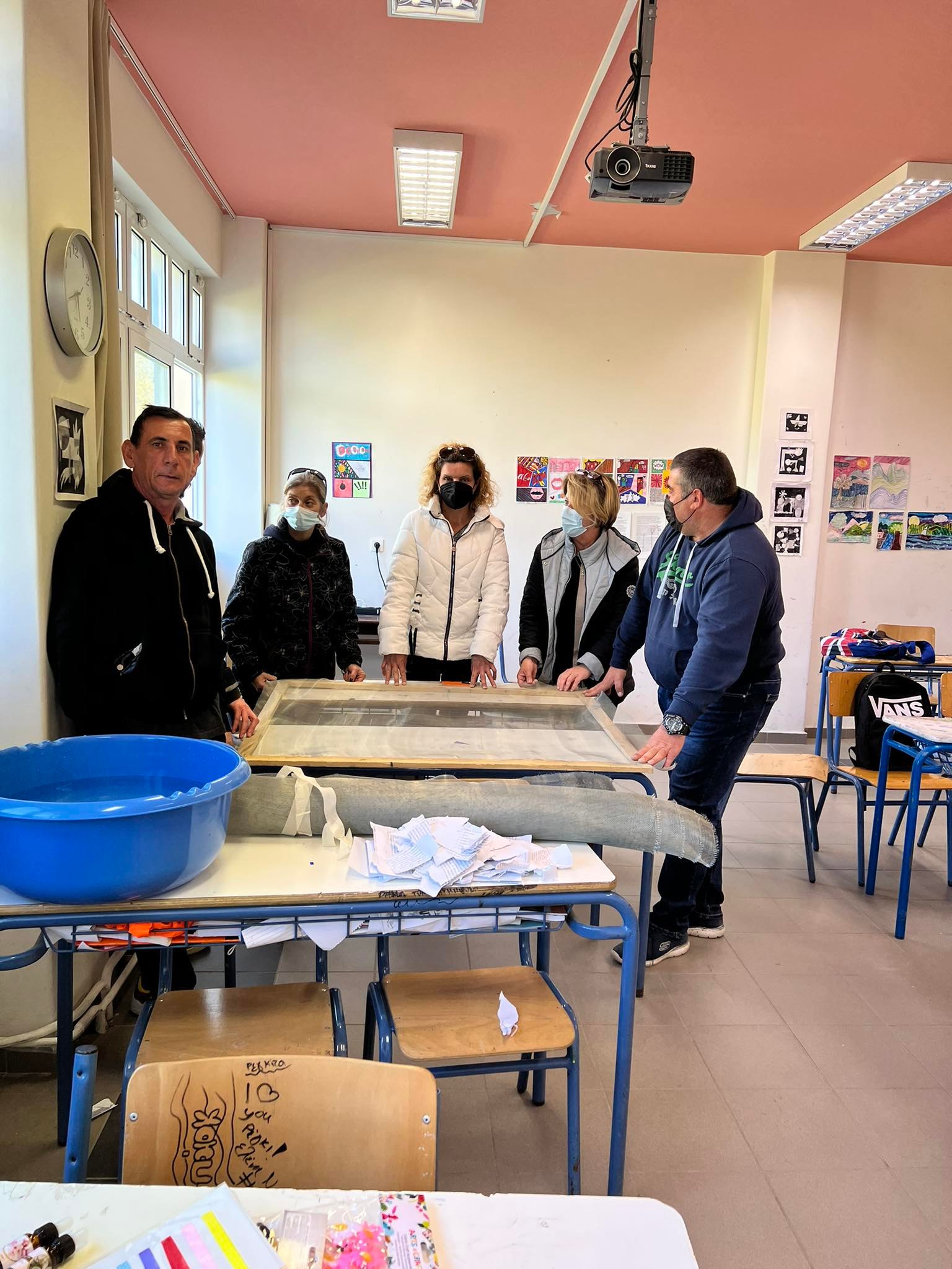Συγκεκριμένα, ακολουθώντας τις αρχές αυτές και επιλέγοντας ως υλικό το χαρτί, διαχώρισαν τα χαρτιά προς απόρριψη στο χώρο του σχολείου και στη συνέχεια τα μετέτρεψαν σε νέο χαρτί το οποίο χρησιμοποίησαν και το φιλοτέχνησαν, προκειμένου να περάσουν περιβαλλοντικά μηνύματα.