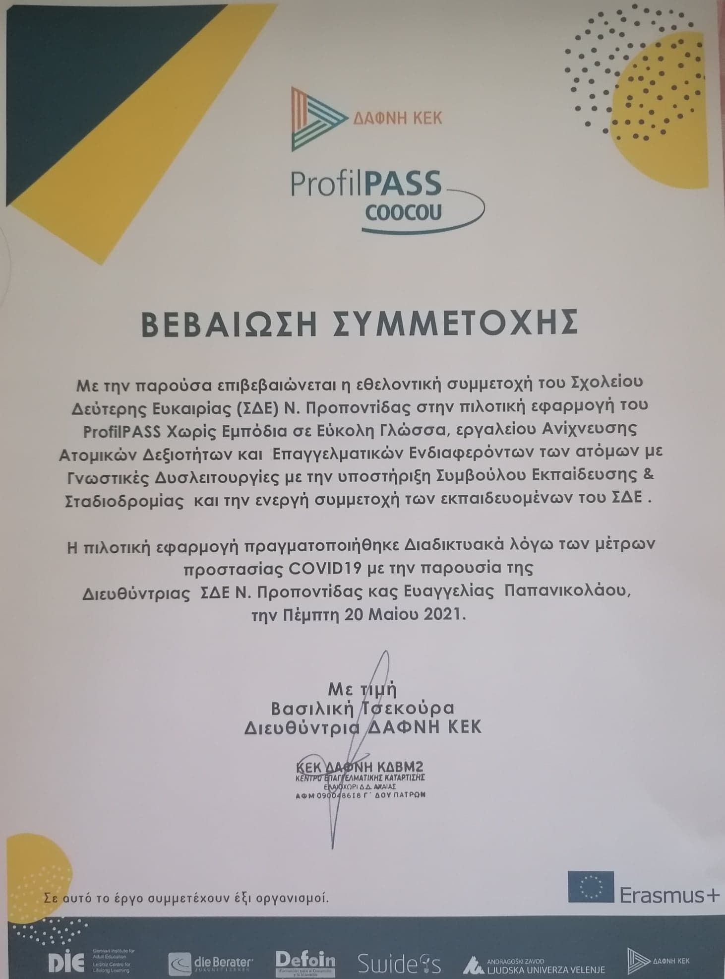 Το ΣΔΕ Ν. Προποντίδας συμμετείχε εθελοντικά με εξ αποστάσεως τρόπο στην πιλοτική εφαρμογή του έργου ERASMUS+ KA204 “COOCOU” , ProfilPass Χωρίς Εμπόδια σε Εύκολη Γλώσσα. Το συγκεκριμένο εργαλείο απευθύνεται σε άτομα που η μητρική τους γλώσσα δεν είναι η Ελληνική και στόχο έχει την δυνατότητα ανίχνευσης των επαγγελματικών ενδιαφερόντων και των ατομικών ικανοτήτων τους.