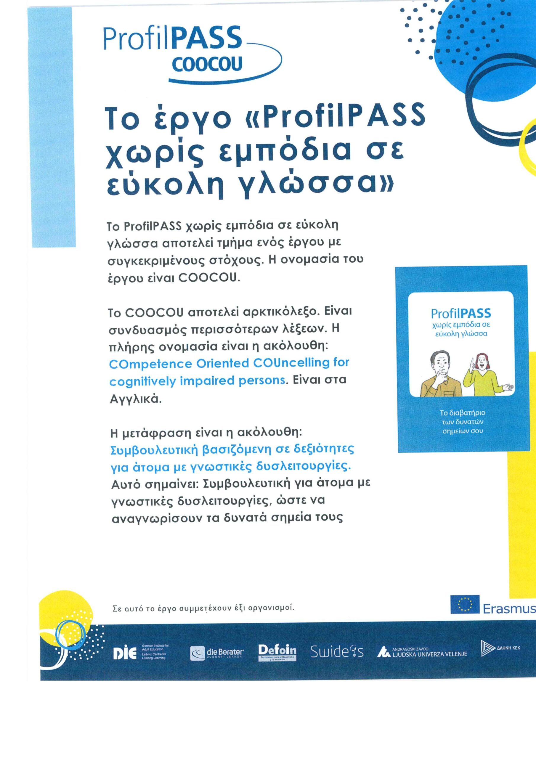 Το όνομα “COOCOU” είναι αρτικόλεξο και στα αγγλικά σημαίνει: COmptence Oriented COUncelling for cognitively impaired persons και στα ελληνικά σημαίνει: Συμβουλευτική βασιζόμενη σε δεξιότητες για άτομα με γνωστικές δυσλειτουργίες.