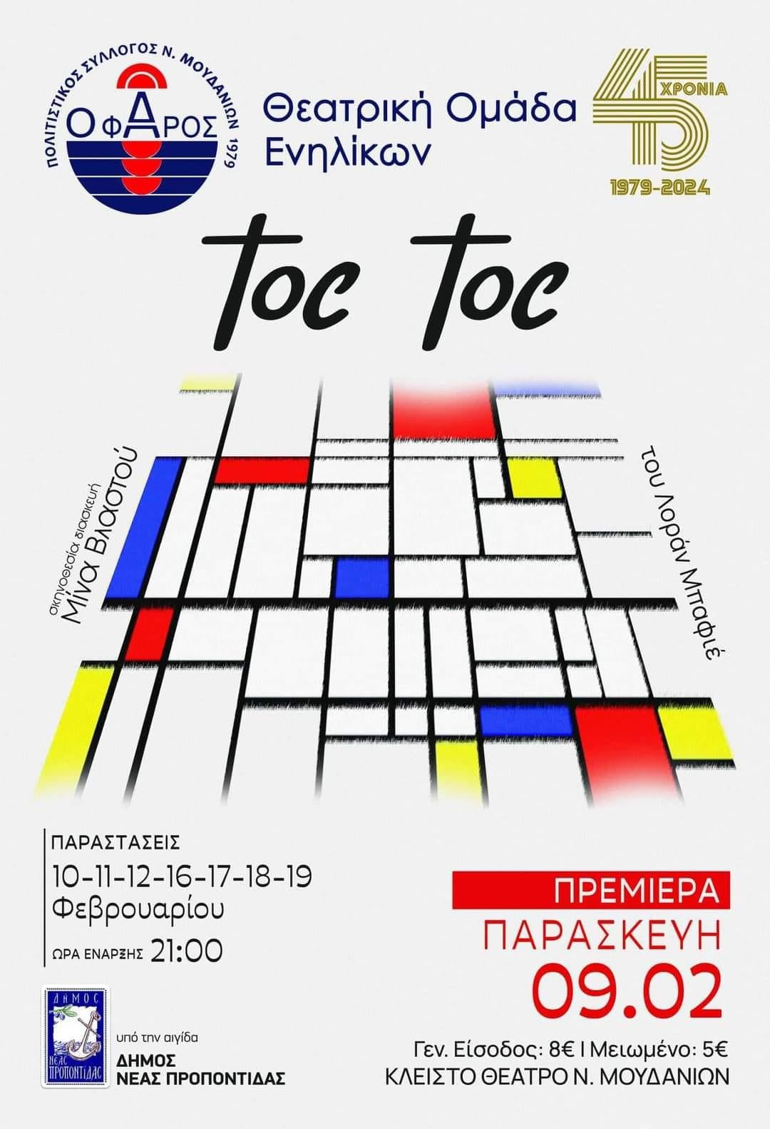Η Θεατρική Ομάδα Ενηλίκων ‘’Ο Φάρος ‘’ σας προσκαλεί στο θεατρικό έργο ‘’Toc – Toc‘’ του Λοράν Μπαφιέ σε σκηνοθεσία της Μίνας Βλαστού, στις 9-10-11-12-16-17-18-19 Φεβρουαρίου στις 21:00 στο Δημοτικό θέατρο Ν. Μουδανιών.