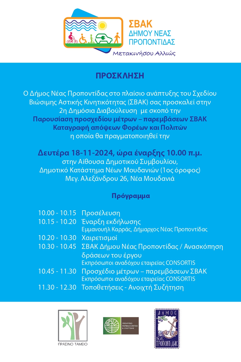 Ο Δήμος Νέας Προποντίδας διοργανώνει την 2η Δημόσια Διαβούλευση στο πλαίσιο εκπόνησης του Σχεδίου Βιώσιμης Αστικής Κινητικότητας – ΣΒΑΚ με σκοπό την Παρουσίαση του προσχεδίου μέτρων – παρεμβάσεων ΣΒΑΚ. Η εκδήλωση θα λάβει χώρα, στην Αίθουσα Δημοτικού Συμβουλίου, Δημοτικό Κατάστημα Νέων Μουδανιών (Μεγ. Αλεξάνδρου 26, Νέα Μουδανιά), την Δευτέρα 18 Νοεμβρίου 2024 και ώρα έναρξης 10.00 π.μ.