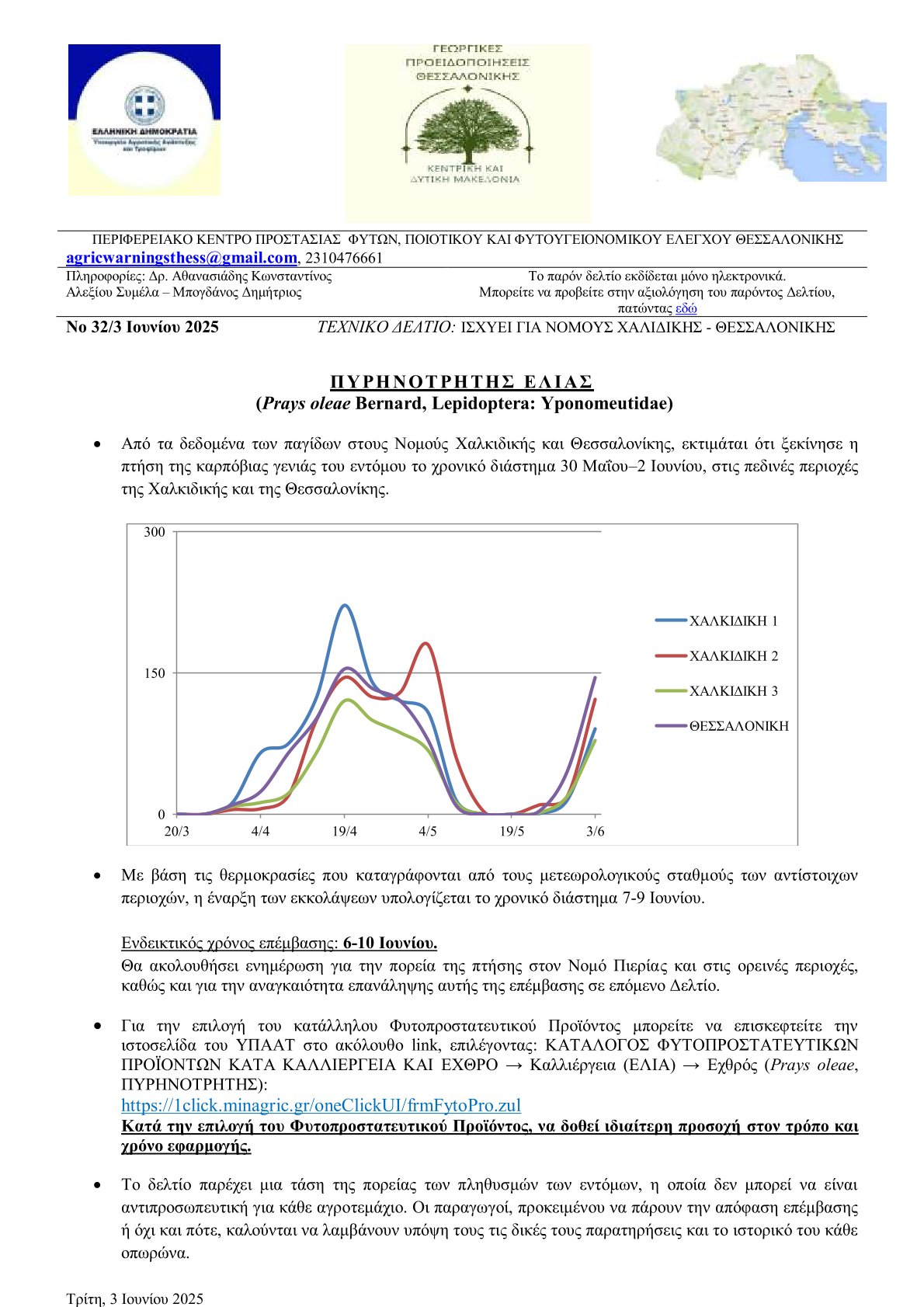 Παρακάτω, μπορείτε να δείτε το Τεχνικό Δελτίο Γεωργικών Προειδοποιήσεων, του Περιφερειακού Κέντρου Προστασίας Φυτών, Ποιοτικού & Φυτοϋγειονομικού Ελέγχου Θεσσαλονίκης, με σημαντικές προειδοποιήσεις σχετικά με τον: