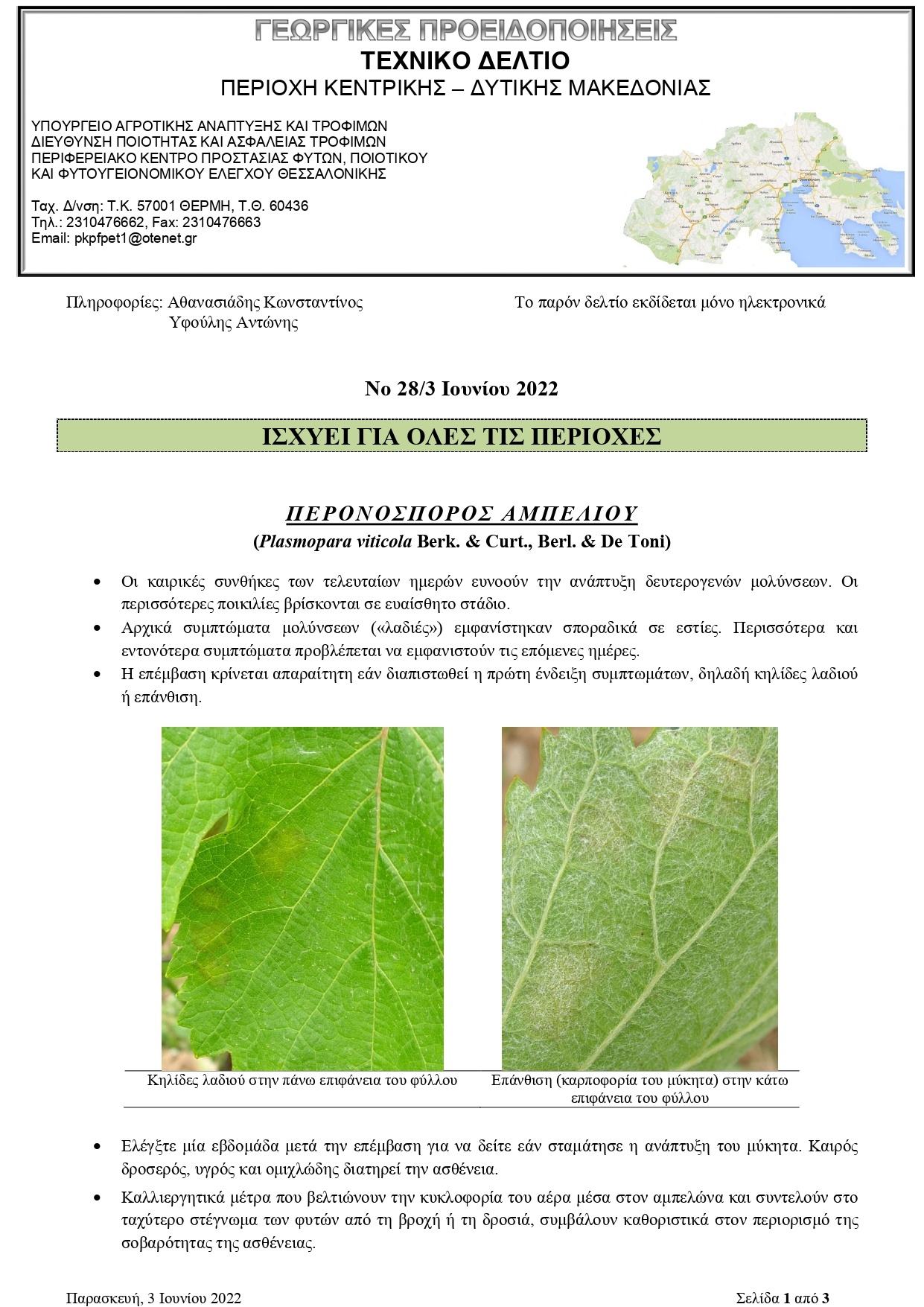 Παρακάτω, μπορείτε να δείτε το Τεχνικό Δελτίο Γεωργικών Προειδοποιήσεων, του Περιφερειακού Κέντρου Προστασίας Φυτών, Ποιοτικού & Φυτοϋγειονομικού Ελέγχου Θεσσαλονίκης, με σημαντικές προειδοποιήσεις σχετικά με την: