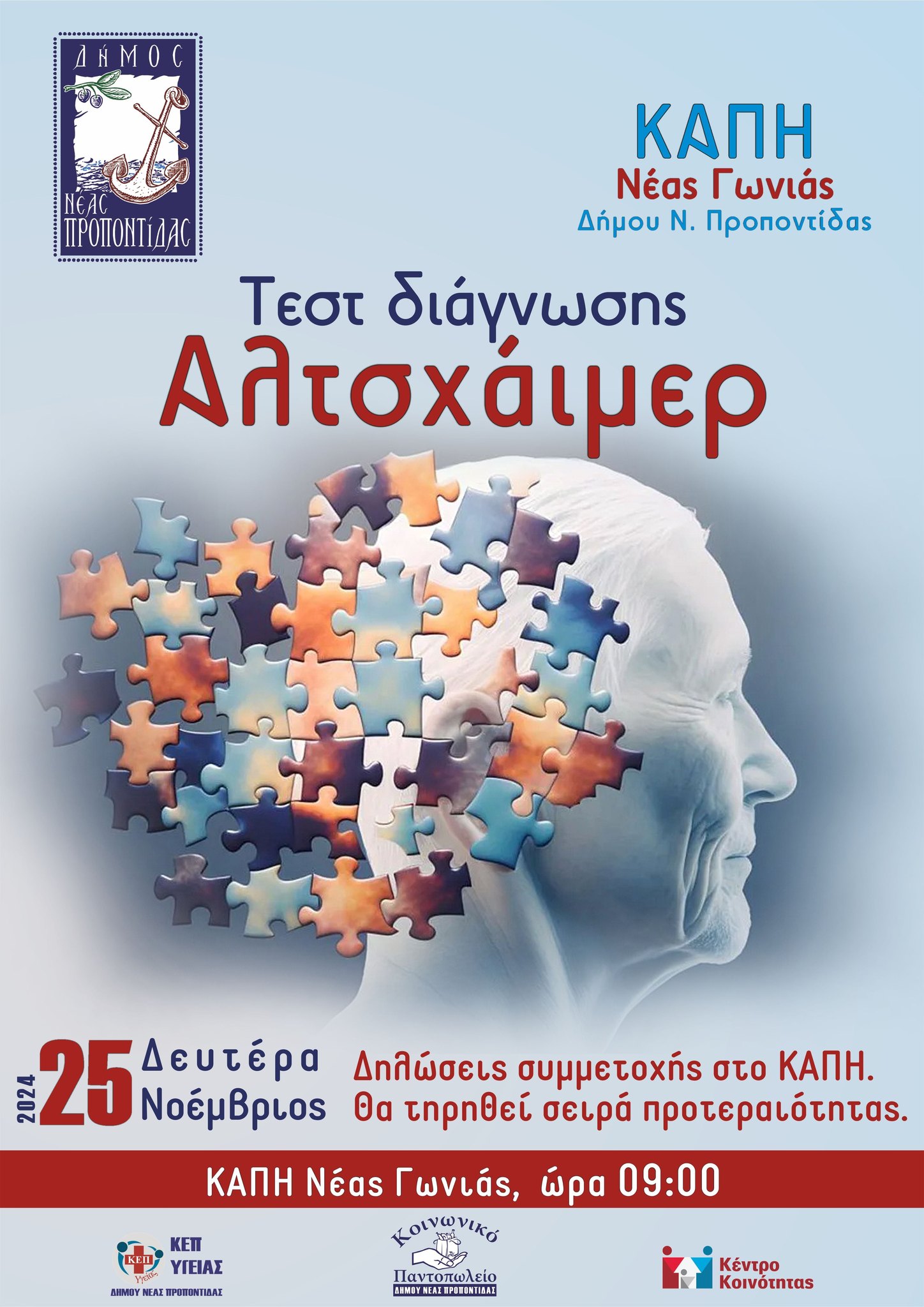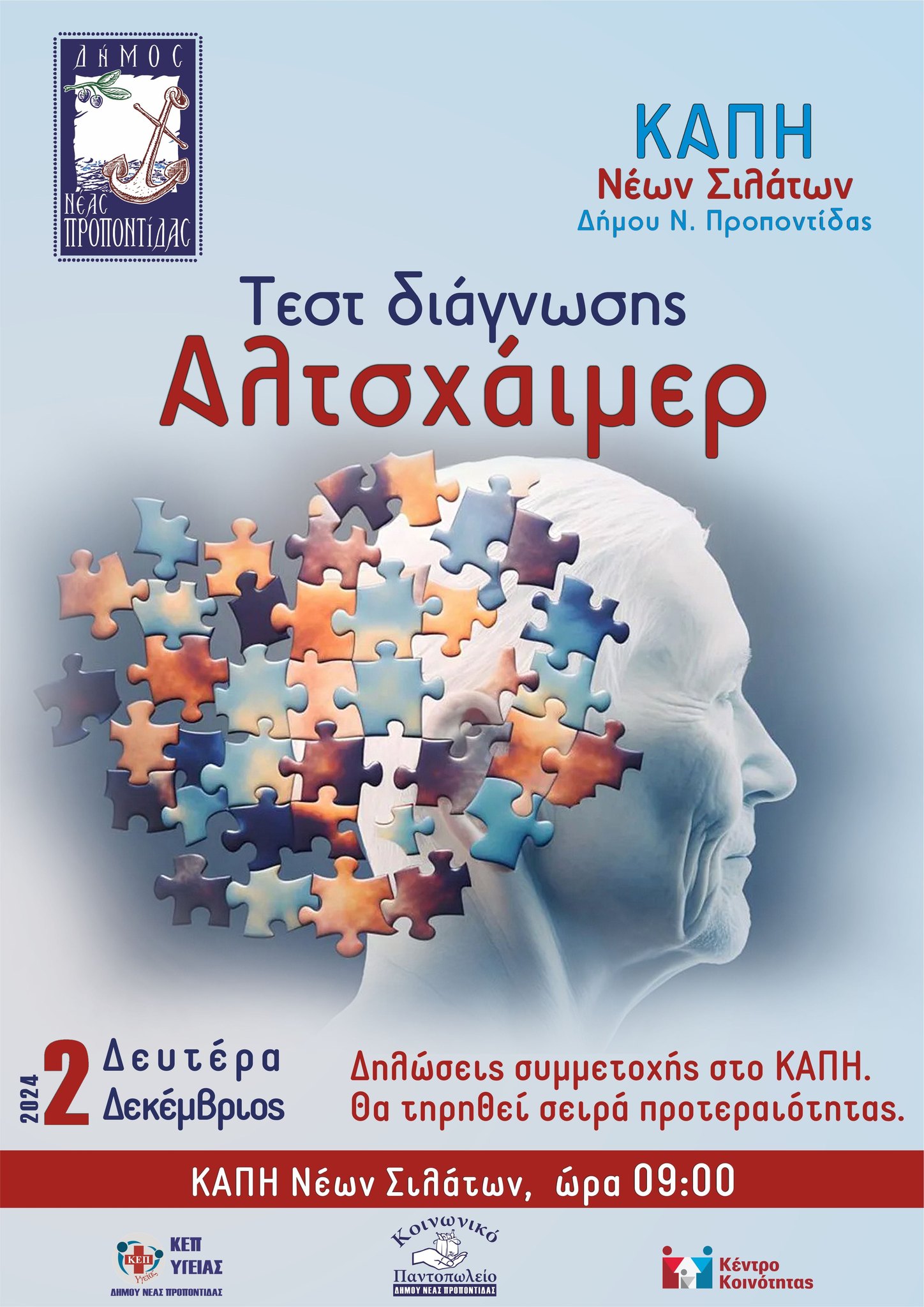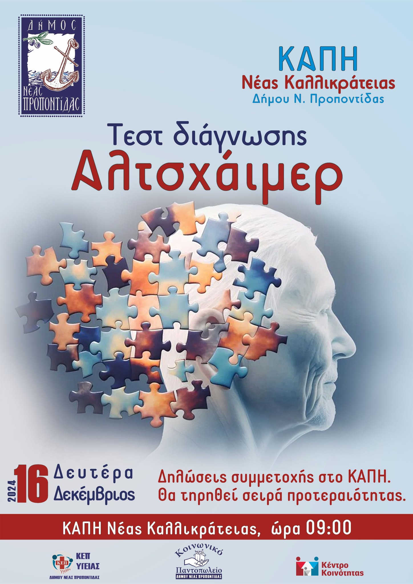 Σειρά δράσεων με σκοπό να γίνει ενημέρωση και τεστ διάγνωσης Αλτσχάιμερ θα πραγματοποιηθούν από τον Δήμο μας στη ΔΕ Καλλικράτειας (έχουν ήδη πραγματοποιηθεί στις ΔΕ Μουδανιών και Τρίγλιας).