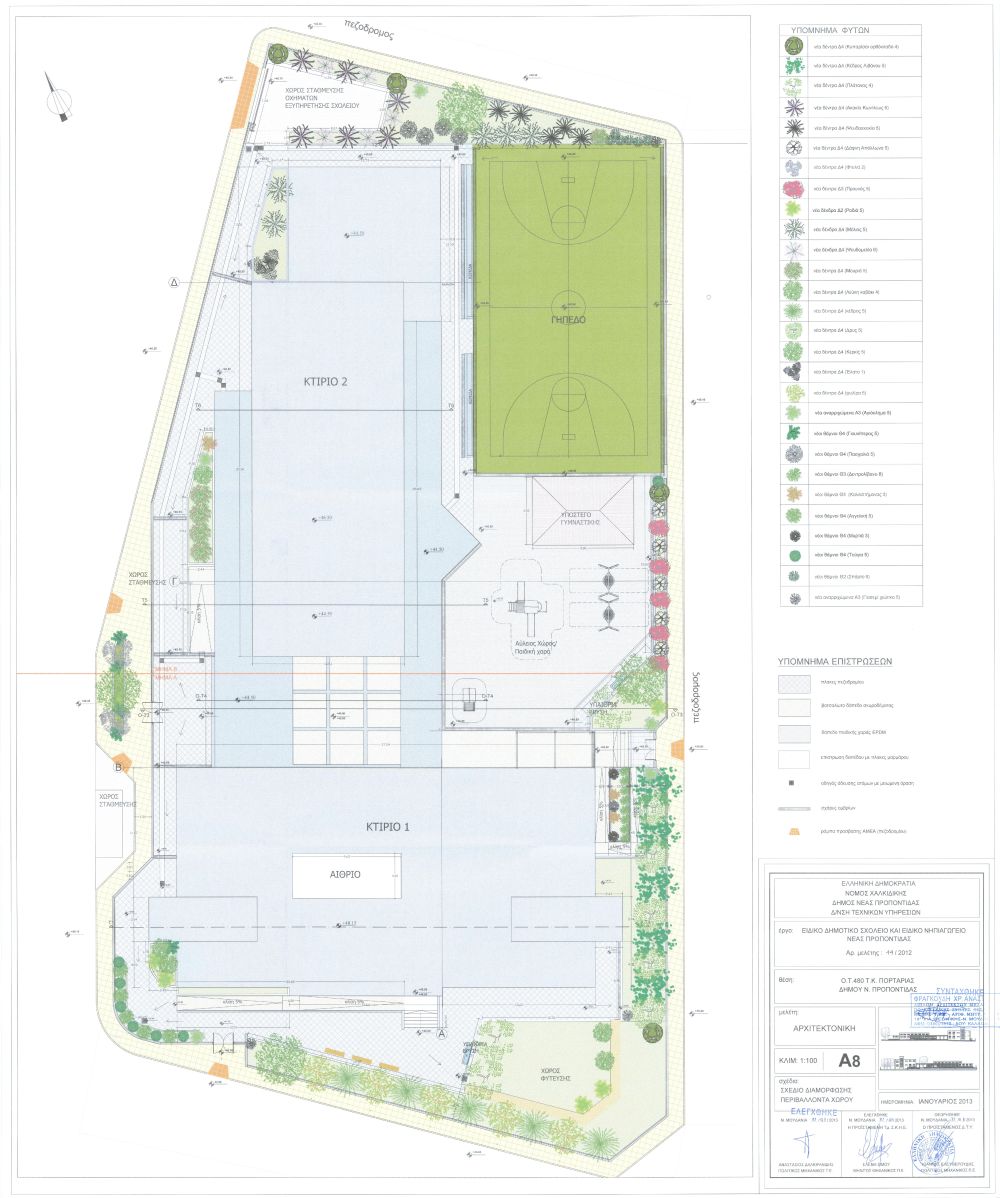 Η συνολική κάλυψη του κτιρίου είναι 1.659,09 τμ. εκ των οποίων 295,21 τ.μ. αποτελούν ημιυπαίθριους χώρους. Στον αύλειο χώρο θα κατασκευασθούν κερκίδες δίπλα στο γήπεδο μπάσκετ. Ο απαραίτητος σταθερός εξοπλισμός των γηπέδων και της παιδικής χαράς θα είναι με προδιαγραφές για ΑΜΕΑ. Επίσης, προβλέπεται οδηγός όδευσης για άτομα με προβλήματα όρασης με πλάκες ειδικού τύπου. Για την είσοδο στο κτιριακό συγκρότημα από τον υπαίθριο χώρο θα υπάρχουν ειδικές ράμπες.