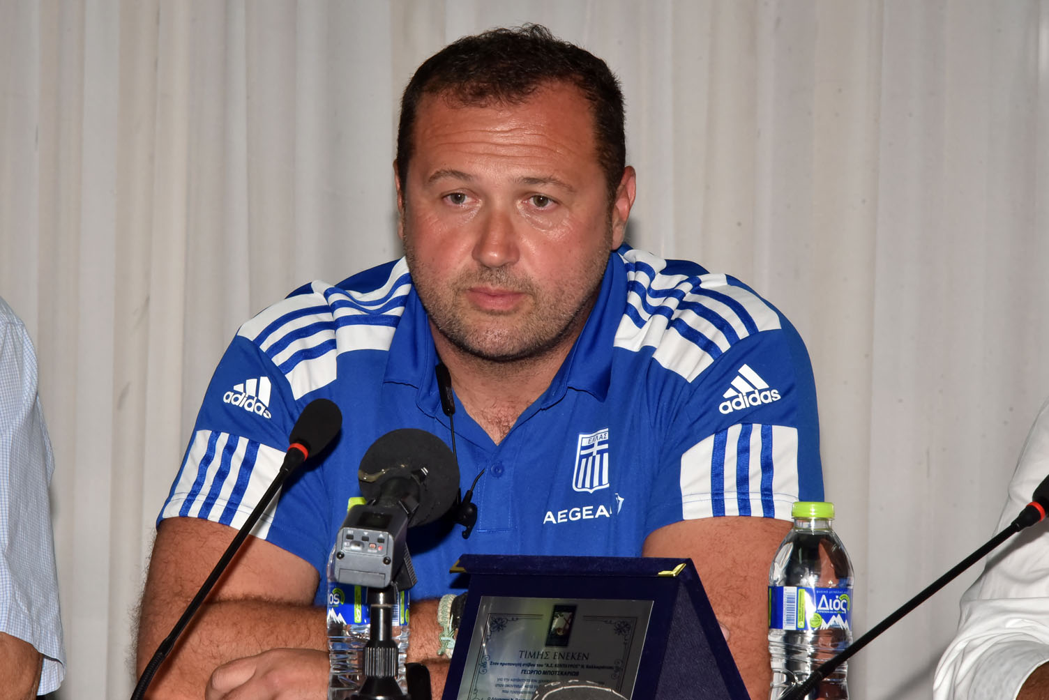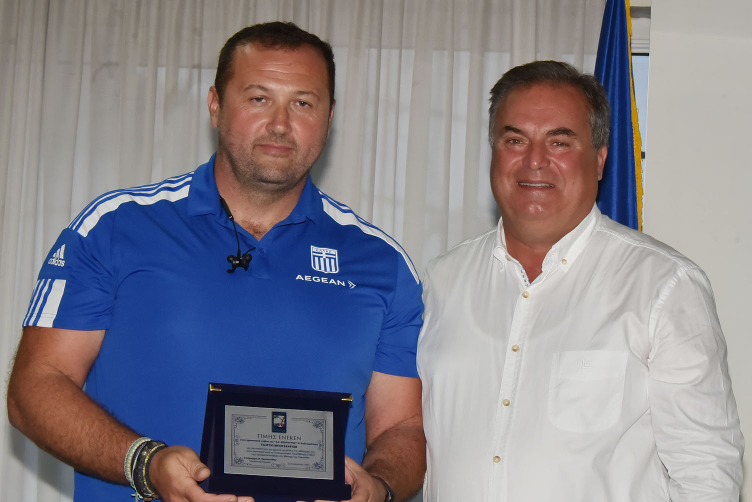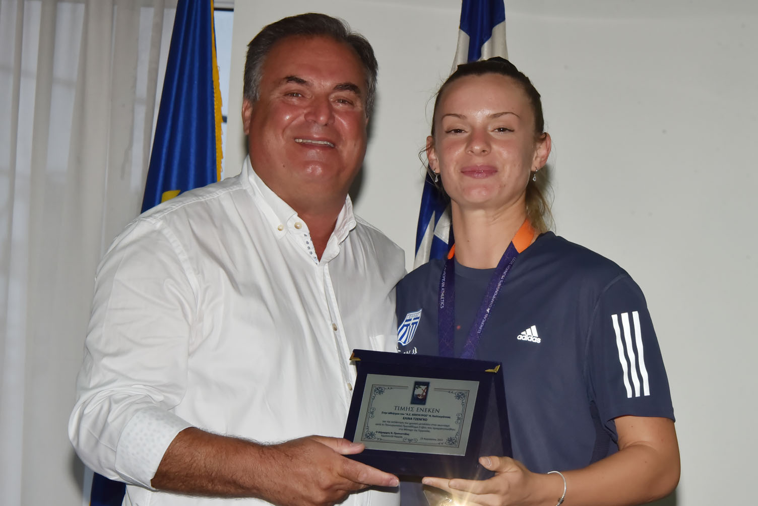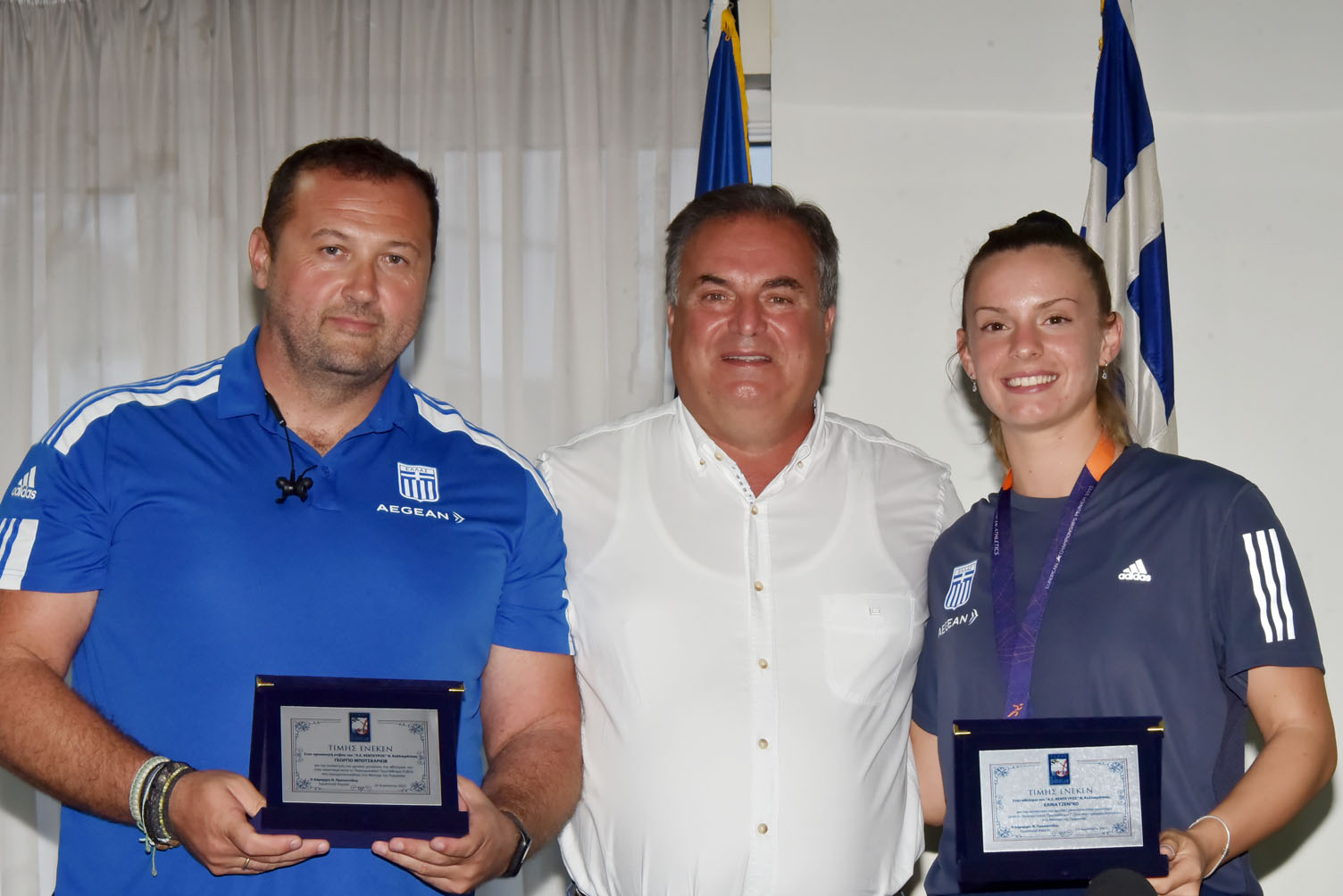 Απευθυνόμενος στη συνέχεια στον προπονητή Γιώργο Μποτσκαρίωβ τόνισε μεταξύ άλλων: “Φίλε Γιώργο, δεν μπορεί κανείς να αμφισβητήσει τη συμβολή σου όχι μόνο σε αυτό το μετάλλιο αλλά συνολικά στην ομάδα στίβου. Είσαι η ψυχή, ο εμπνευστής, ο καθοδηγητής και δημιουργός των επιτυχιών. Σε ευχαριστούμε”.