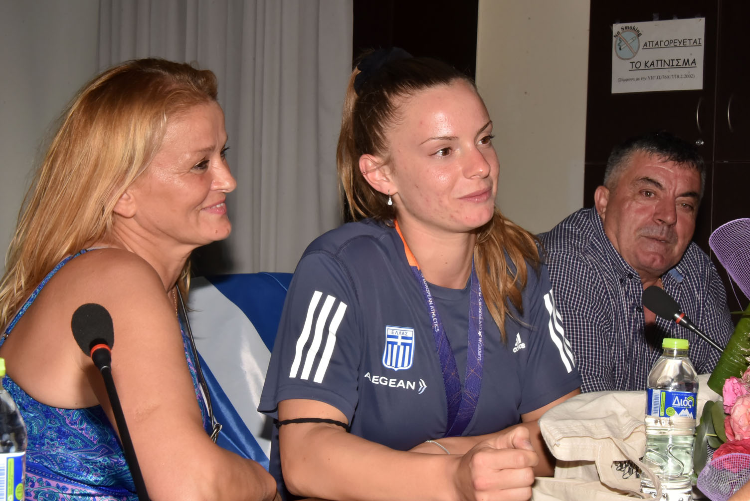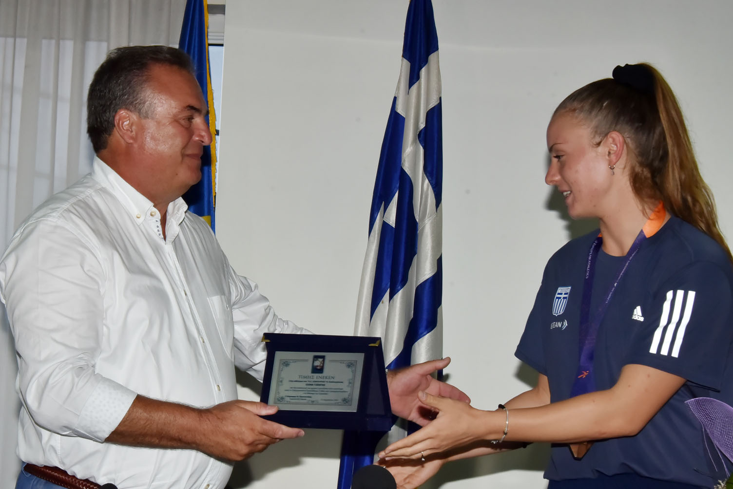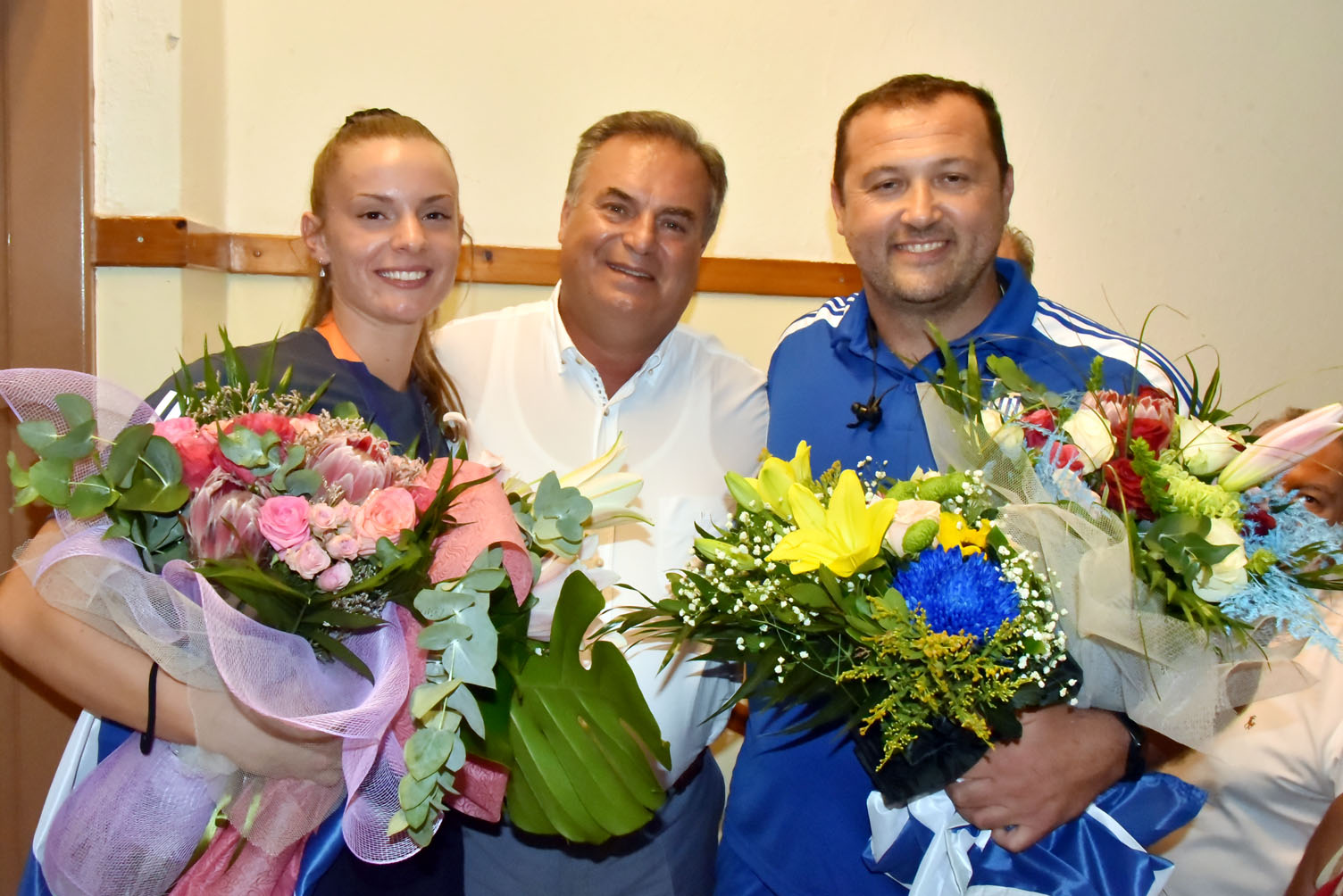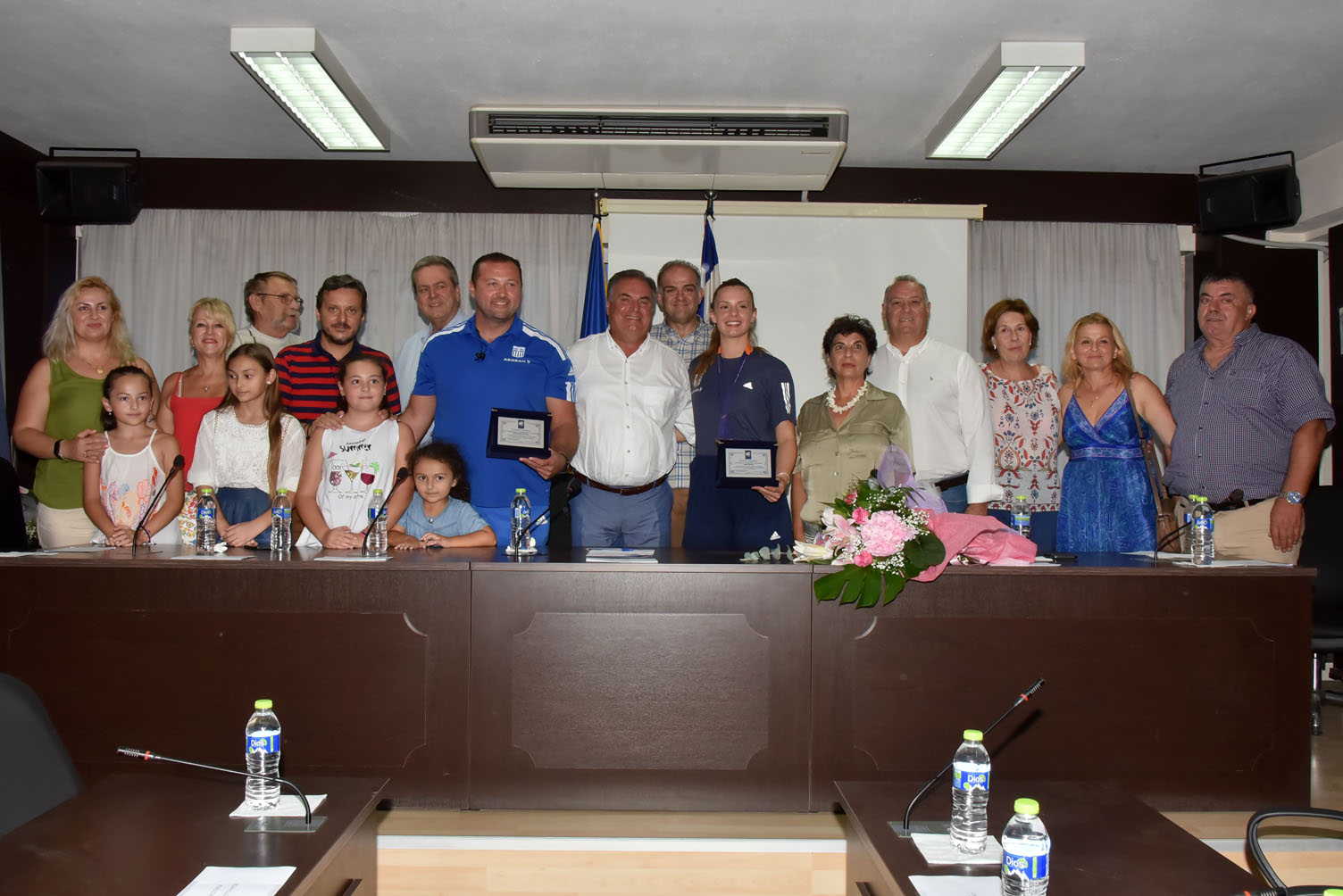 Ο Δήμαρχος Μ. Καρράς στη συνέχεια τους παρέδωσε τιμητική πλακέτα ως ελάχιστη ένδειξη ευγνωμοσύνης για την επιτυχία τους. Παίρνοντας τον λόγο ο προπονητής Γ. Μποτσκαρίωβ ανέφερε μεταξύ άλλων: “Σας ευχαριστούμε για την τιμή και τη ζεστή υποδοχή. Οι εγκαταστάσεις είναι απαραίτητες για την ασφάλεια των αθλητών αλλά δε γεννούν πρωταθλητές. Δε μου αρέσουν οι πολιτικές διαστάσεις που δόθηκαν. Είμαι προπονητής κι όχι πολιτικός. Εμείς σας θέλουμε όλους κοντά μας. Δήμαρχε, σε ευχαριστώ για την τιμή και που, παρά τα όσα δέχτηκες, σήμερα είσαι εδώ και μας τιμάς”. Κάλεσμα ενότητας, σύμπνοιας αλλά και στήριξης από όλους απηύθυνε με τη σειρά της και η Ελίνα Τζένκο.