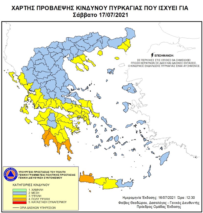 Σύμφωνα με τον από 16/7/2021 Ημερήσιο Χάρτη Πρόβλεψης Κινδύνου Πυρκαγιάς που εκδίδει η Γενική Γραμματεία Πολιτικής Προστασίας του Υπουργείου Προστασίας του Πολίτη (www.civilprotection.gr), για αύριο Σάββατο 17-7-2021, προβλέπεται ΥΨΗΛΟΣ κίνδυνος πυρκαγιάς (κατηγορία κινδύνου 3) για τον Δήμο μας.