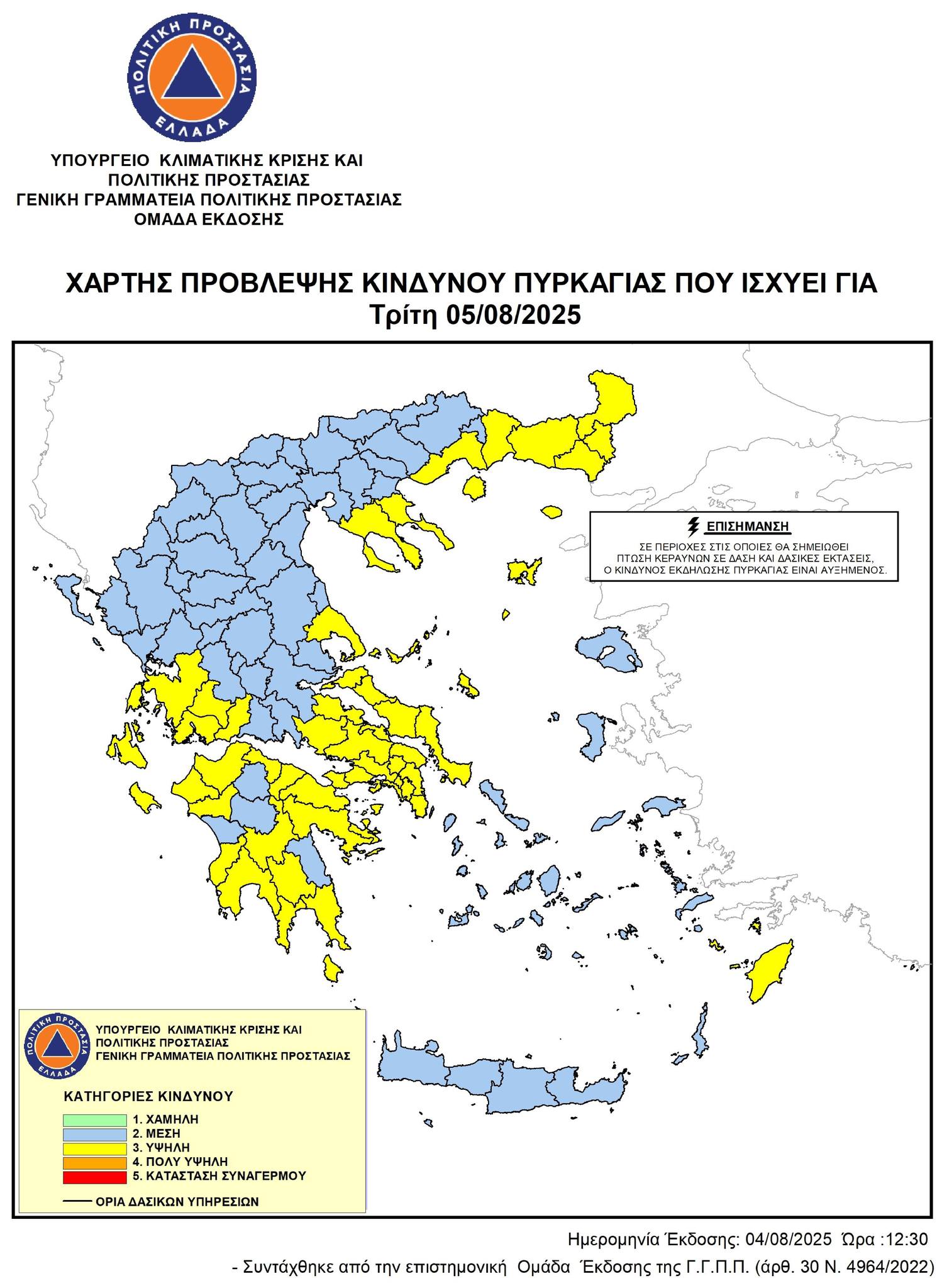 Σας ενημερώνουμε ότι σύμφωνα με τον από 4/8/2025 Ημερήσιο Χάρτη Πρόβλεψης Κινδύνου Πυρκαγιάς, που εκδίδει η Γενική Γραμματεία Πολιτικής Προστασίας του Υπουργείου Προστασίας του Πολίτη (www.civilprotection.gr), για αύριο Τρίτη 5/8 προβλέπεται ΥΨΗΛΟΣ κίνδυνος πυρκαγιάς (κατηγορία κινδύνου 3) (Π.Ε. Χαλκιδικής).