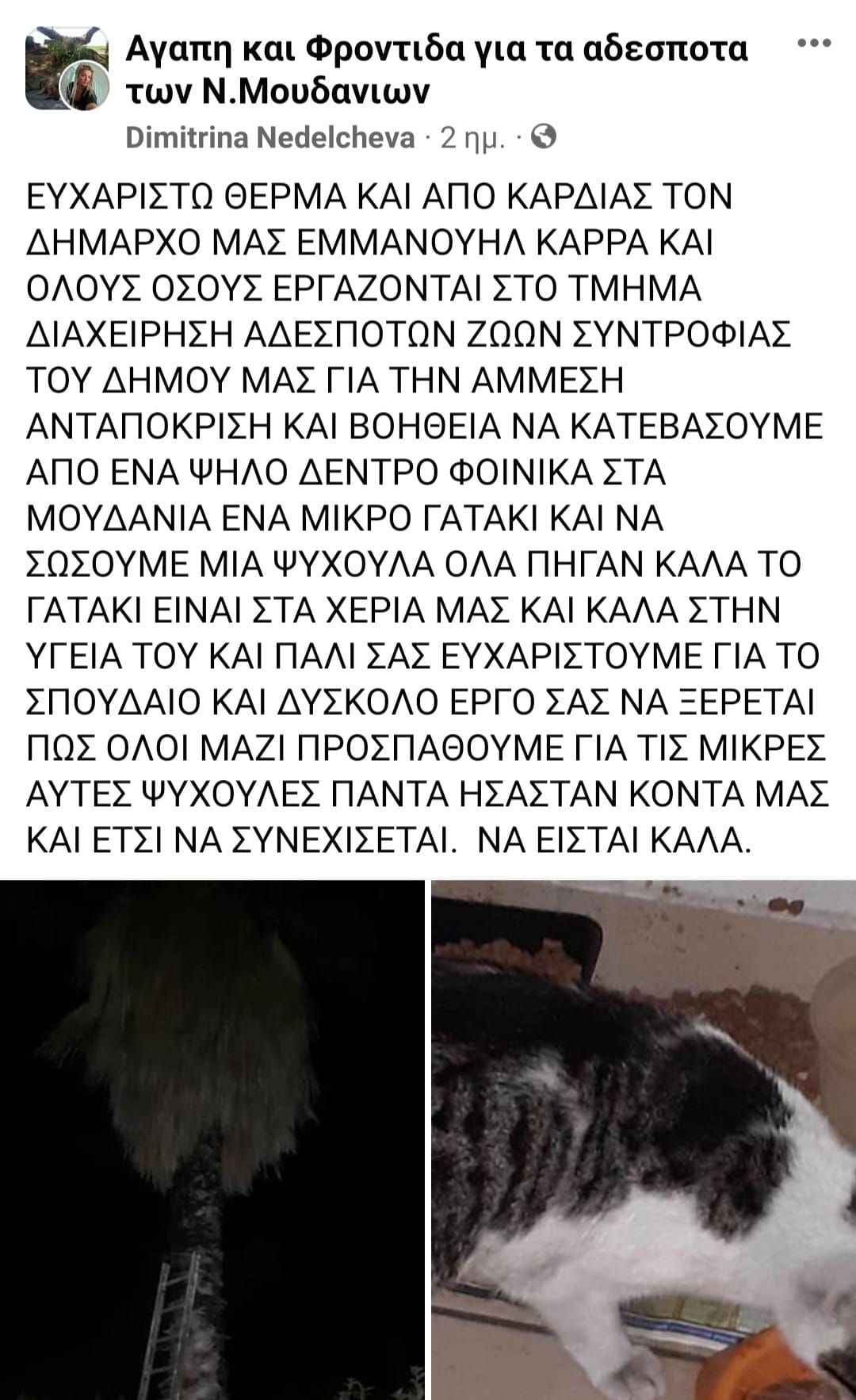 Με συντονισμένη προσπάθεια των εργαζομένων του τμήματος διαχείρισης αδέσποτων ζώων του Δήμου και τη συνδρομή της πυροσβεστικής υπηρεσίας (2 πυροσβέστες κι ένα όχημα) σώθηκε μία φοβισμένη γάτα που είχε σκαρφαλώσει σε έναν ψηλό φοίνικα. Η προσπάθεια ήταν δύσκολη εξαιτιας του μεγάλου ύψους αλλά …τέλος καλό, όλα καλά.